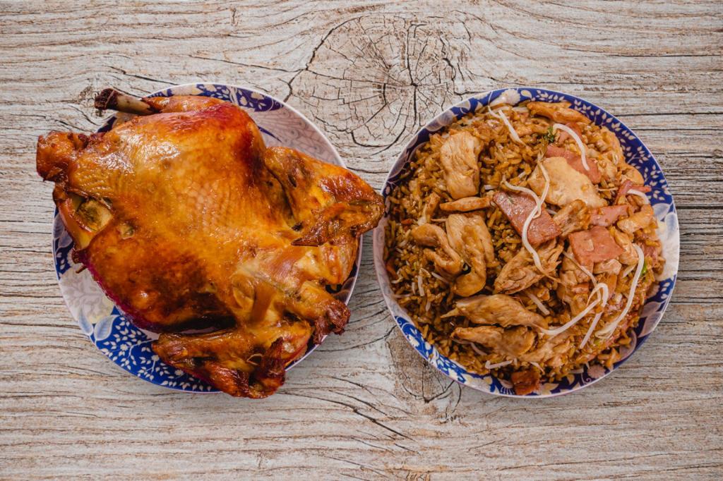 Arroz chino con pollo entero asado para 7 o 8 personas