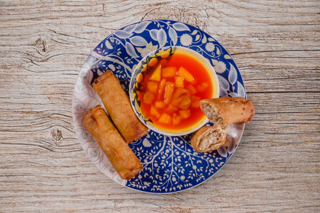 arroz con pimenton , cebolla de huevo, zanahoria, maiz, y 1 lumpia