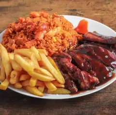 Arroz Premium acompañado de 5 costillas en salsa BBQ y papas francesas.+ gaseosa+ arroz para 5 personas
