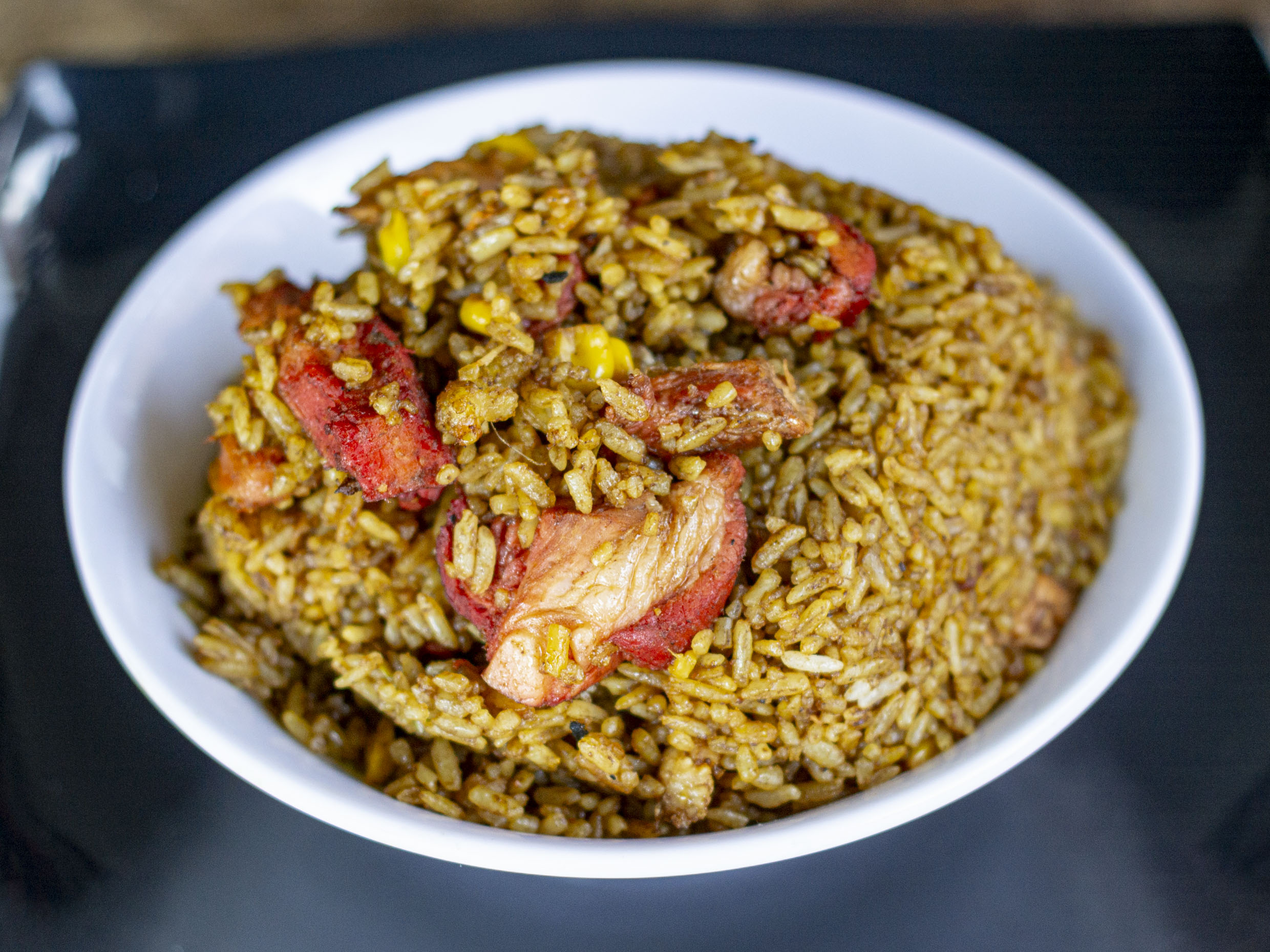 Arroz, pollo, soya, jamón, raíces chinas y cebollín.