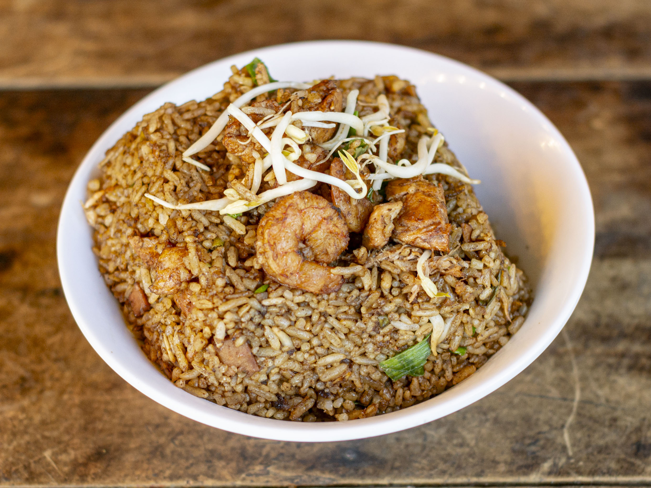 Arroz, pollo, cerdo, raíces china y jamón.