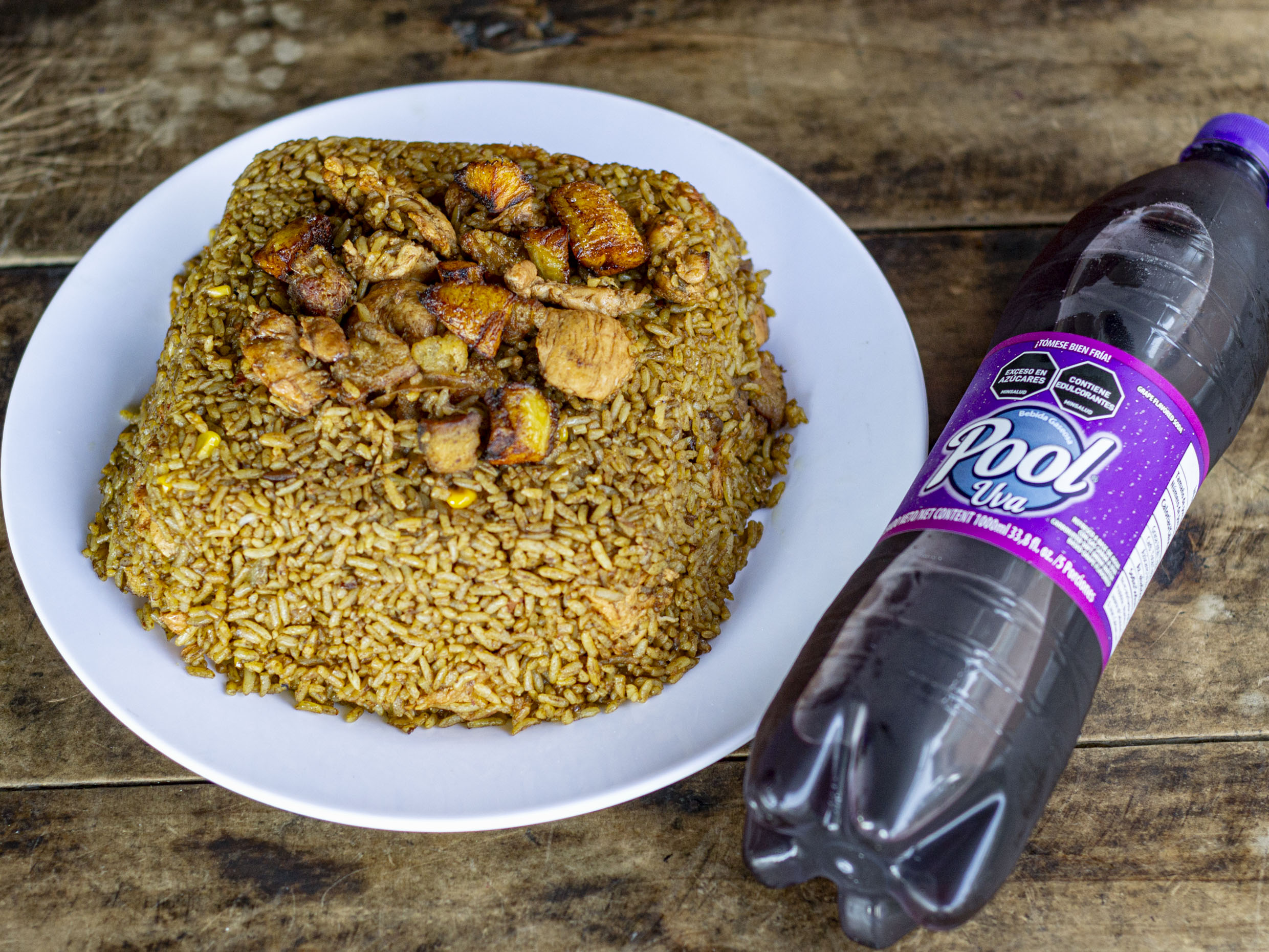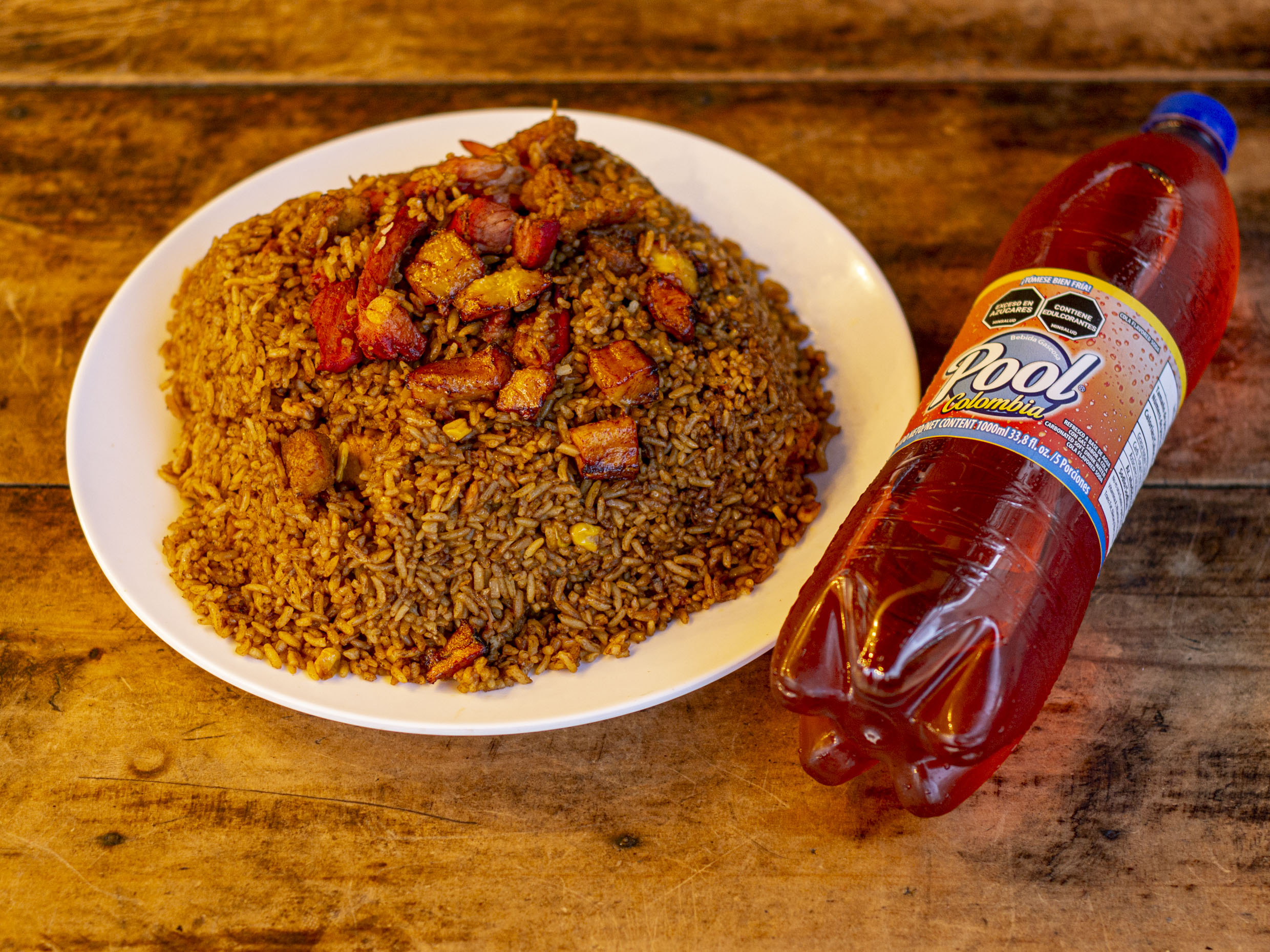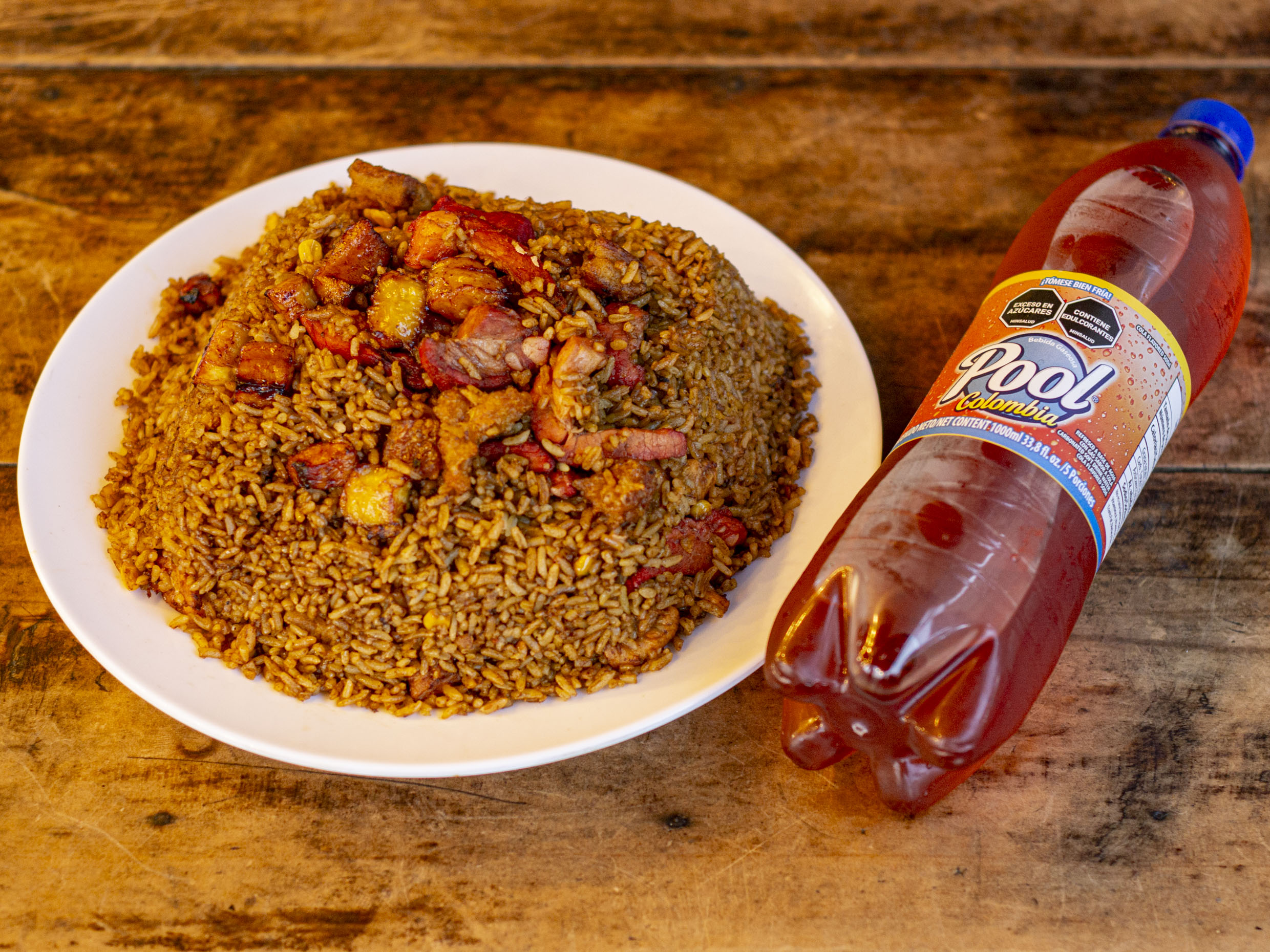 Exquisito arroz paisa contiene; trozos de pollo, pernil de cerdo, chicharrón, maicitos, plátano maduro, chorizo de ternera y Gaseosa econólitro marca pool, sabor a disponibilidad: Manzana, colombiana, uva, naranjada o spray.