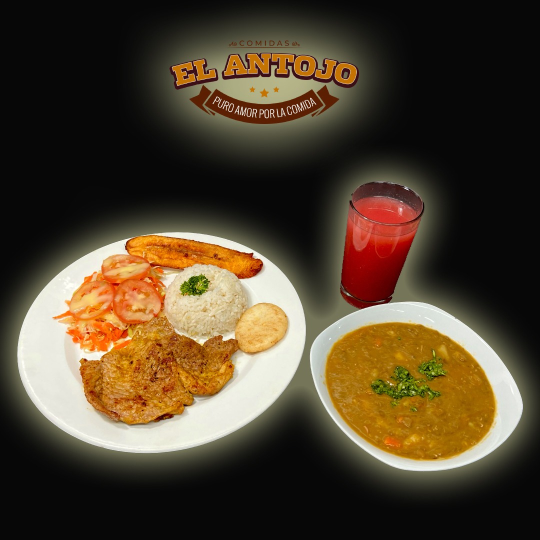 120 g De proteína de carne de res asada , arroz blanco( 1 porción personal), maduro (1 tajada), ensalada, arepita ( 1 pieza) , frijoles o sopa de (12 onzas ) , jugo de ( 14 onzas )