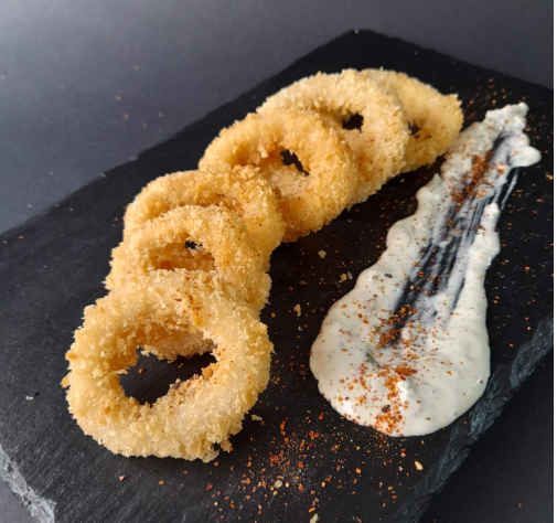 6 unidades de calamares tempura ,acompañados con salsa dinamita de la casa