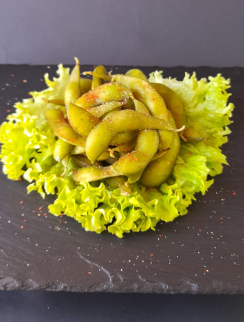 granos de soya salteados con sal , togarashi y aceite de ajonjoli