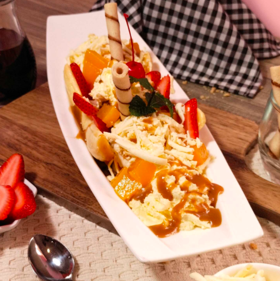 Copa con un sabor de helado, papaya, mango, banano, manzana, fresas y cereza, queso, crocantes barquillos rellenos, leche condensada, crema de leche y chantilly