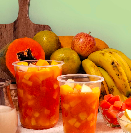 Deliciosa mezcla de frutas frescas; papaya, mango, manzana, banano, y jugo natural de naranja