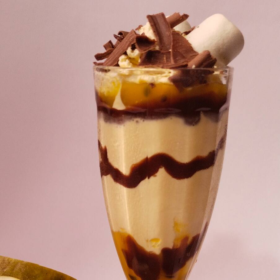 Cremosa malteada con helado de maracuyá, Salsa de pulpa de maracuyá, salsa de chocolate, Chantilly, esponjosos masmelos y astillas de chocolate