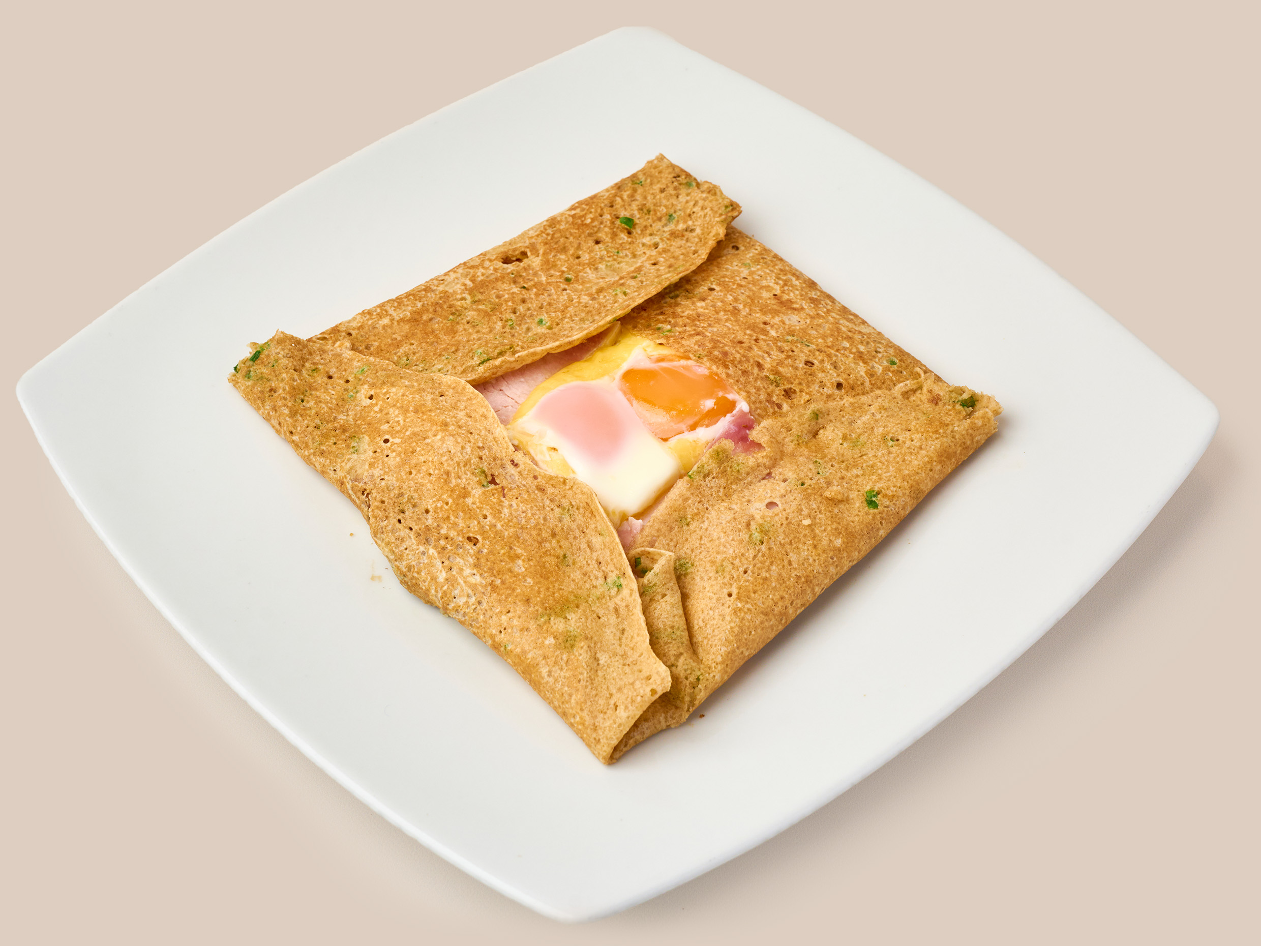 Crepe con jamón ahumado, queso y huevo.