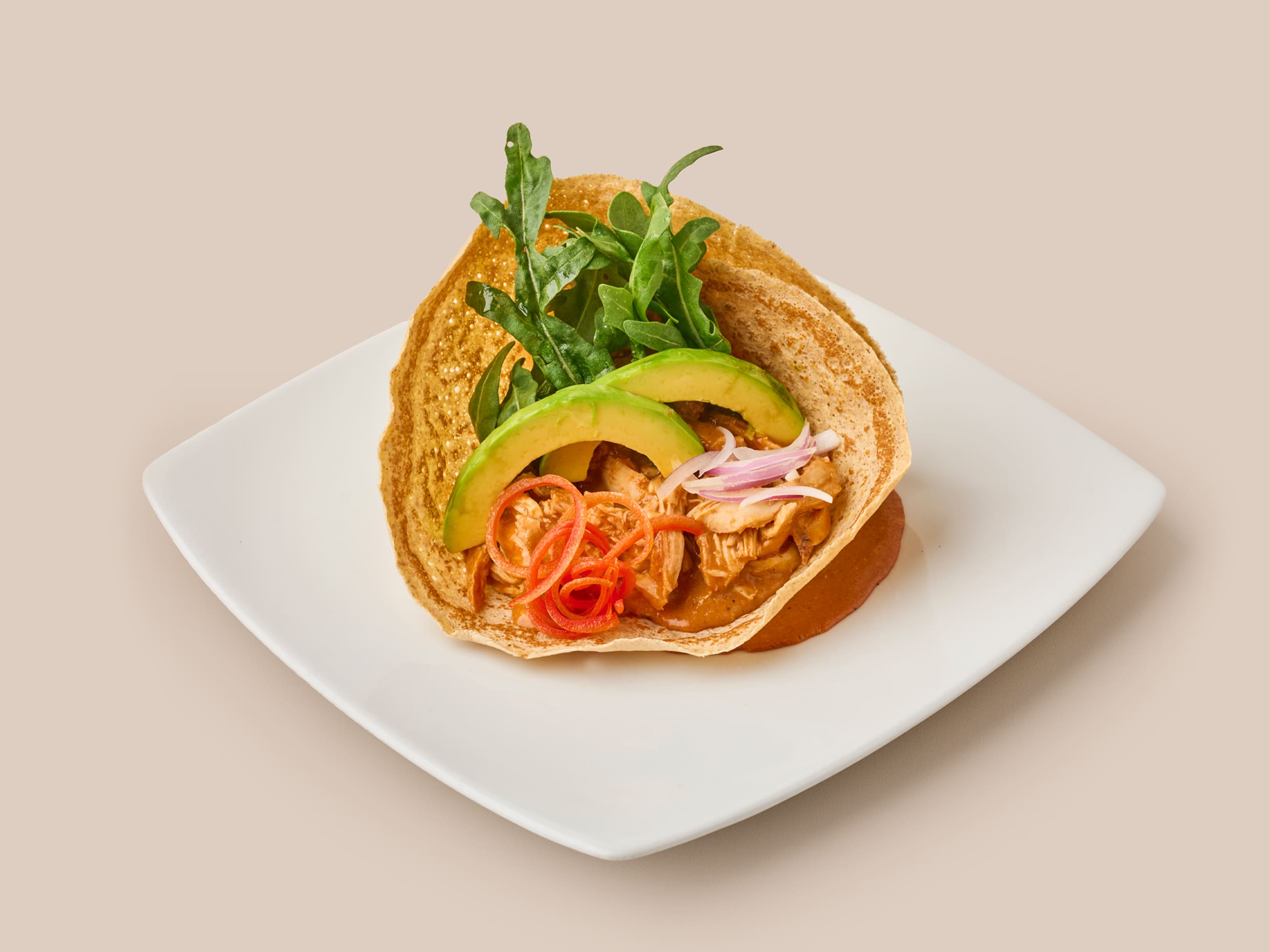Preparación mexicana de cerdo desmechado, tonos cítricos y un toque de aguacate, lechuga, pico de gallo, cebolla encurtida y crema agria.