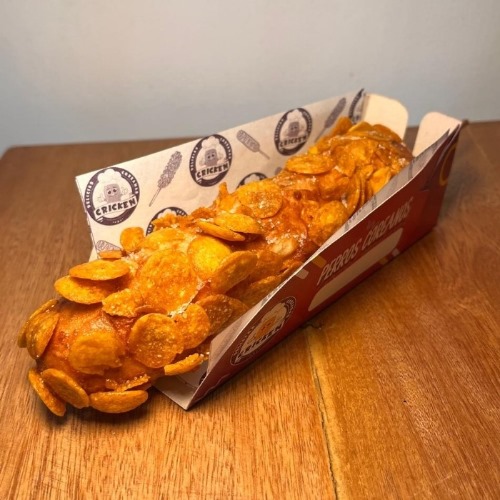 Corn dog con relleno de queso, apanado con zucaritas y espolvoreado en azúcar.