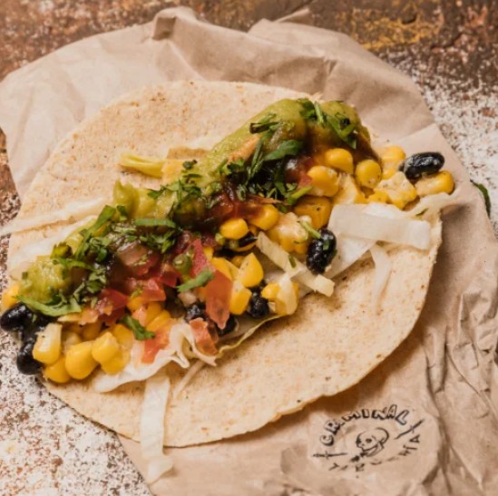 Totilla de maíz, frijol negro con maíz dulce en vinagreta de cilantro, guacamole, lechuga, tomate, mermelada de jalapeño y cilantro.