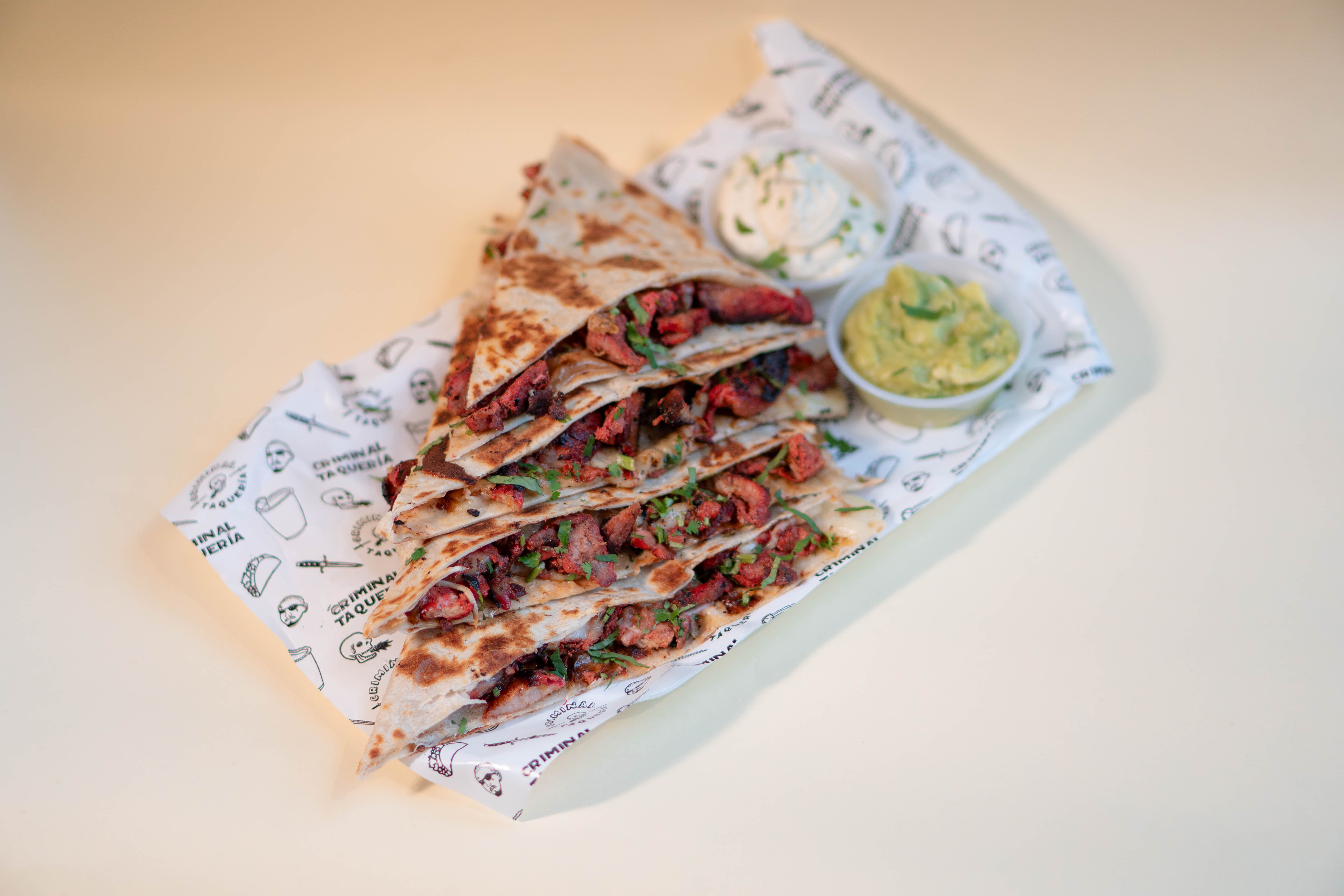 Tortilla, queso mozzarella, salsa taquera y cilantro. Acompañada de Guacamole y Sour cream