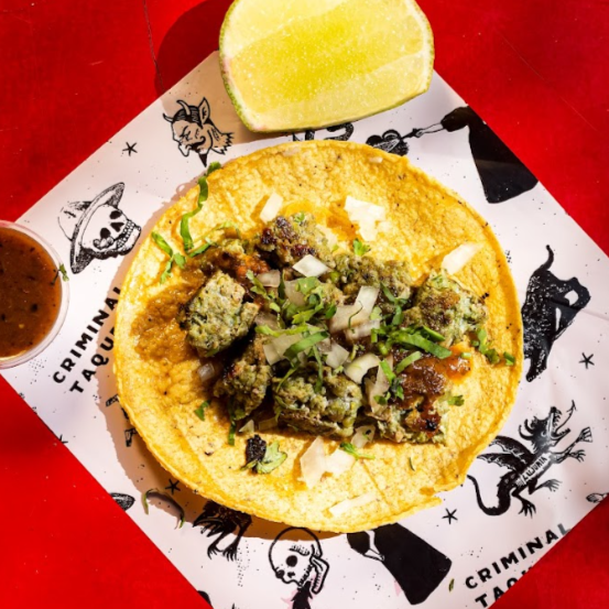 Tortilla de maíz, carnitas de res a la plancha, guacamole, salsa taquera y cilantro.
