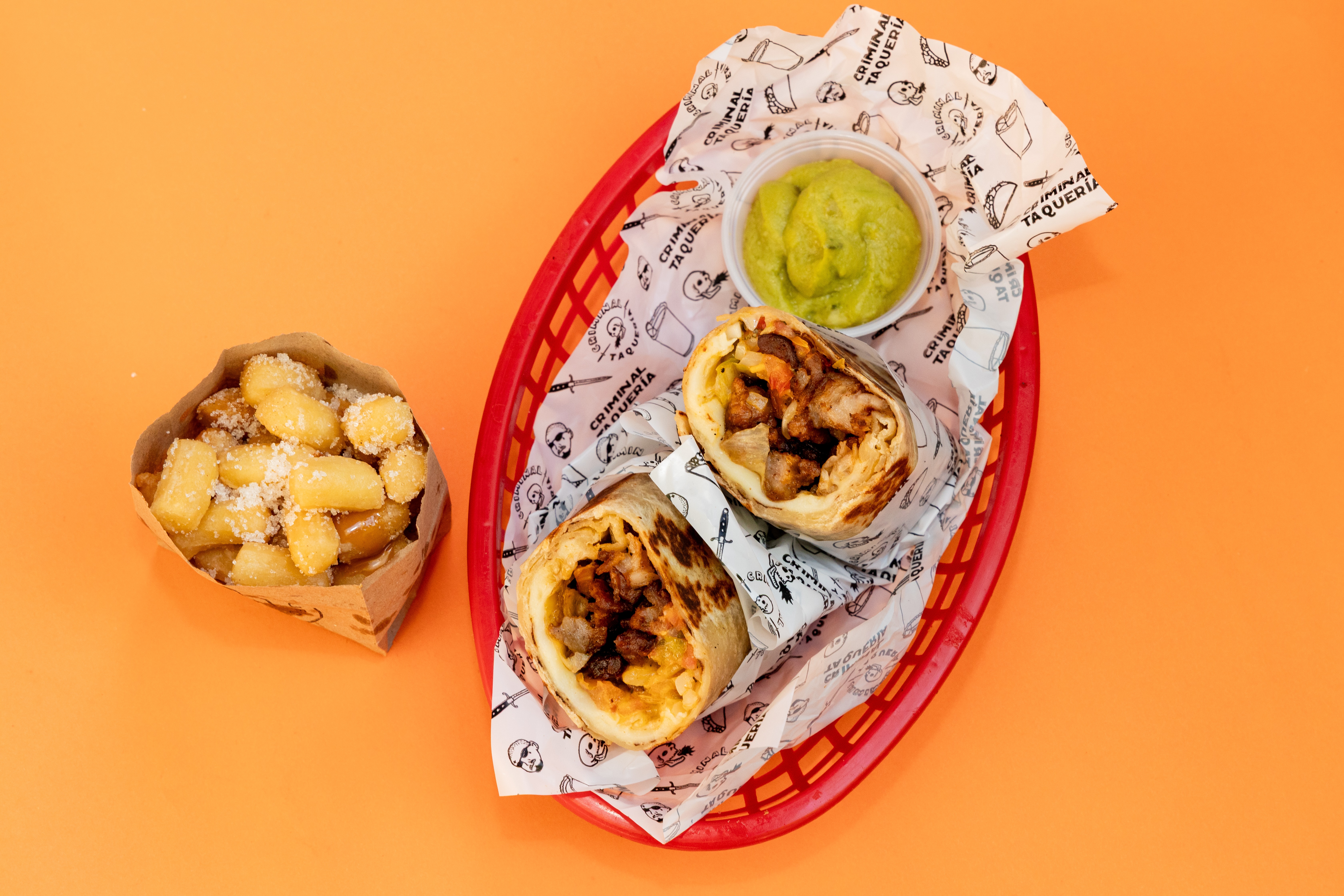 Tortilla de harina, queso fundido, lechuga, salsa taquera, tomate, pastor, salsa cheddar y cilantro.