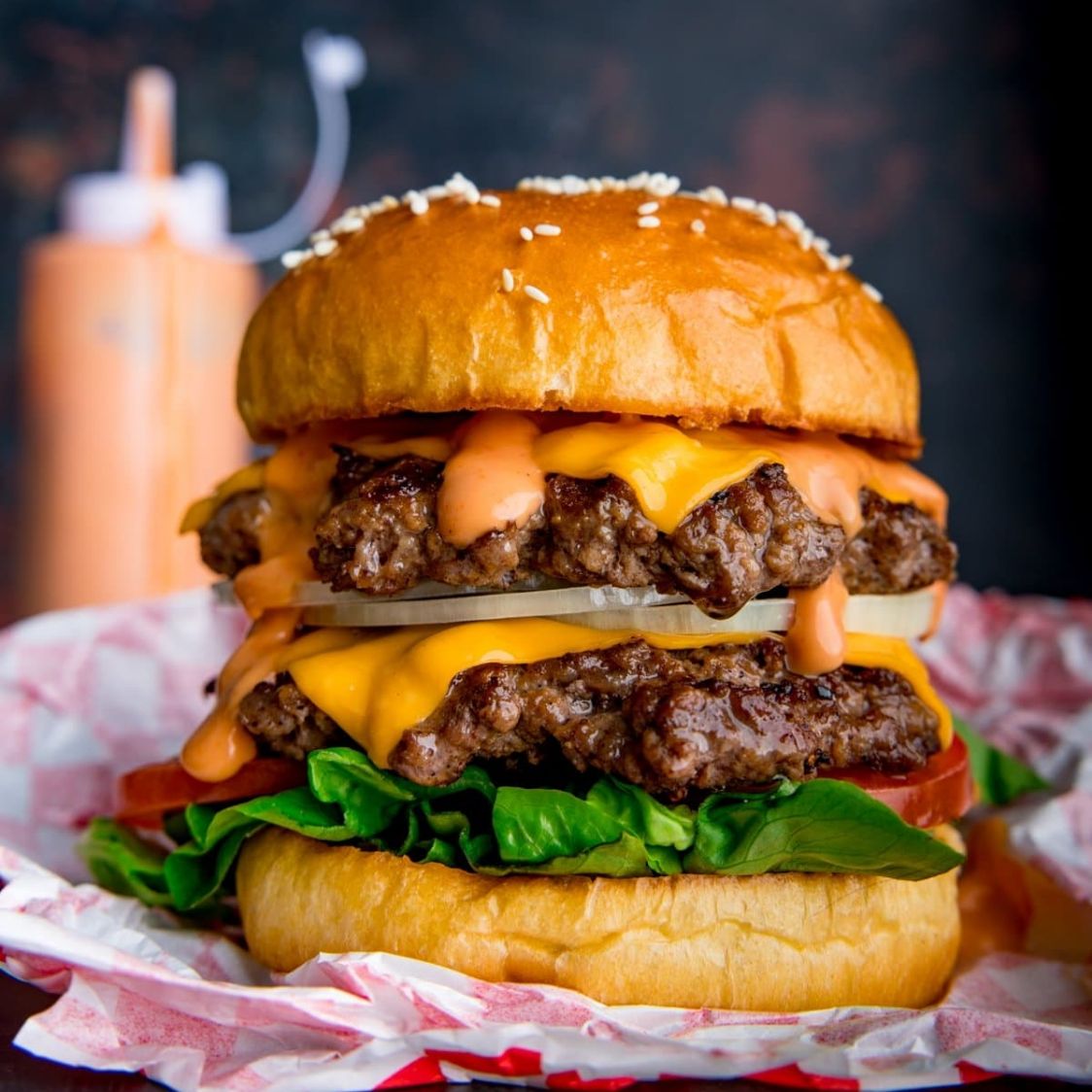 Pan artesanal, 2 carnes de res artesanal de 150gr cada una, lechuga crespa, tomate, cebolla, tocineta, queso, salsa de ajo y BBQ Mapple