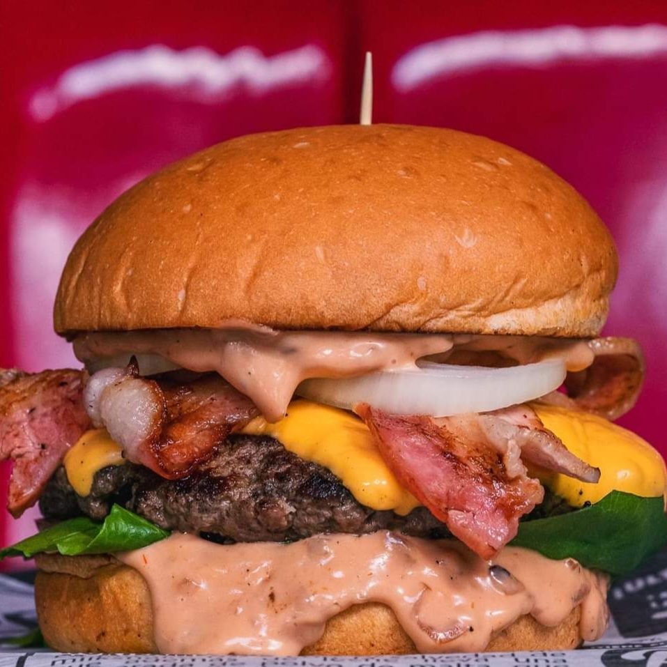 Pan artesanal, 150gr de carne de res artesanal, pico de gallo, (cebolla picada, tomate picado, cilantro), guacamole (aguacate, cebolla picada, limón, cilantro), jalapeños, tocineta, nachos, queso cheddar y salsa de ajo y BBQ Mapple