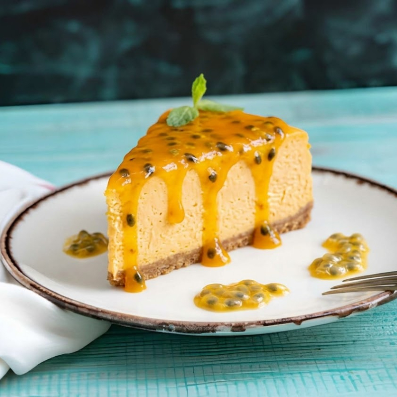 Cheesecake horneado estilo New York de maracuyá, cremoso y con el balance perfecto entre dulce y ácido.
