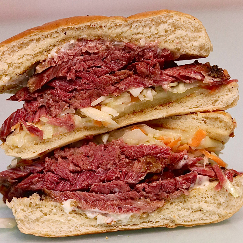 Sandwich de pastrami de 150 gramos con coleslaw, salsa tartara, queso mozarella, pan brioche