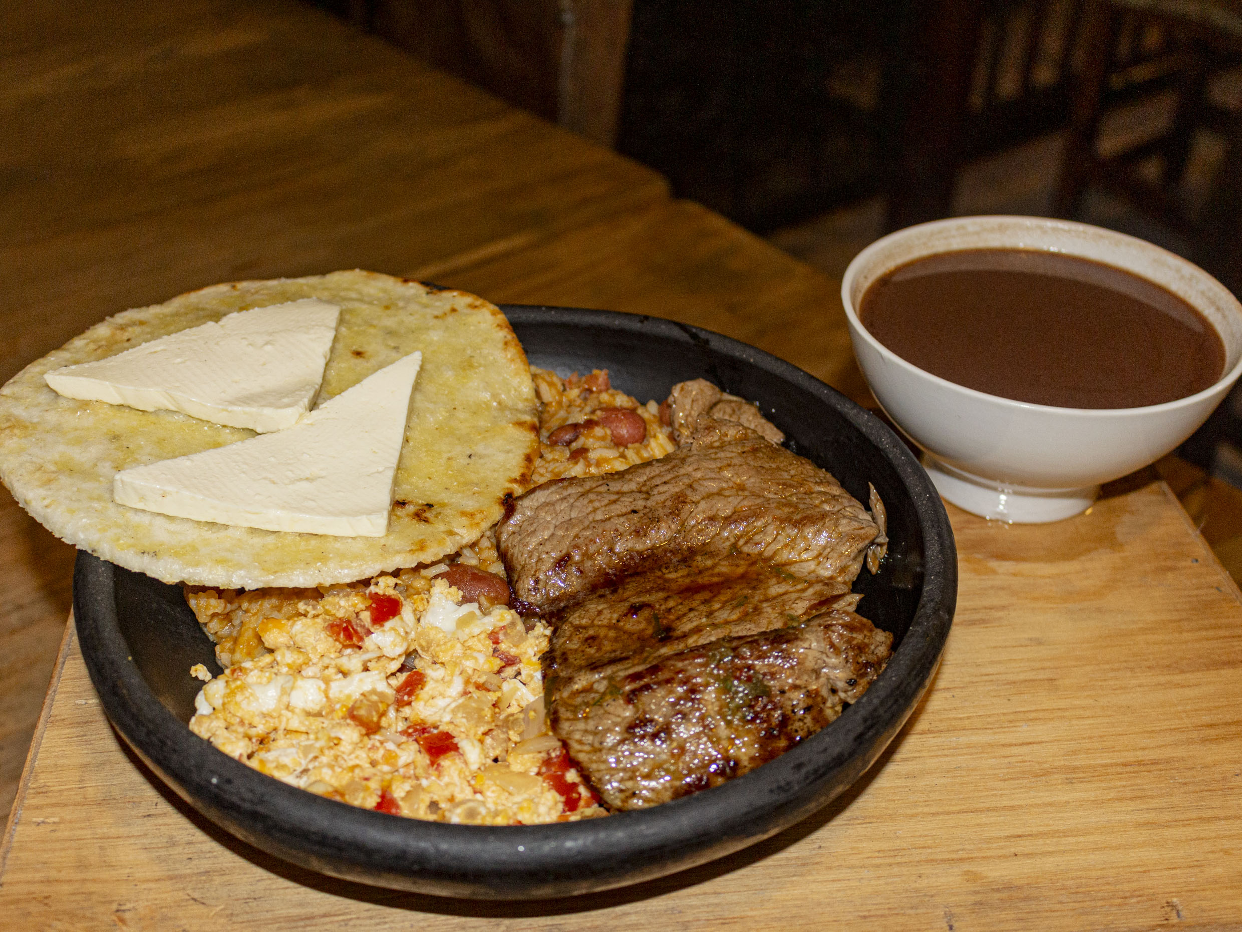 Arepita con quesito, huevos fritos, revueltos o con hogado, chocolatico caliente y lo mejor es que por eso escoger la carnita que querés.