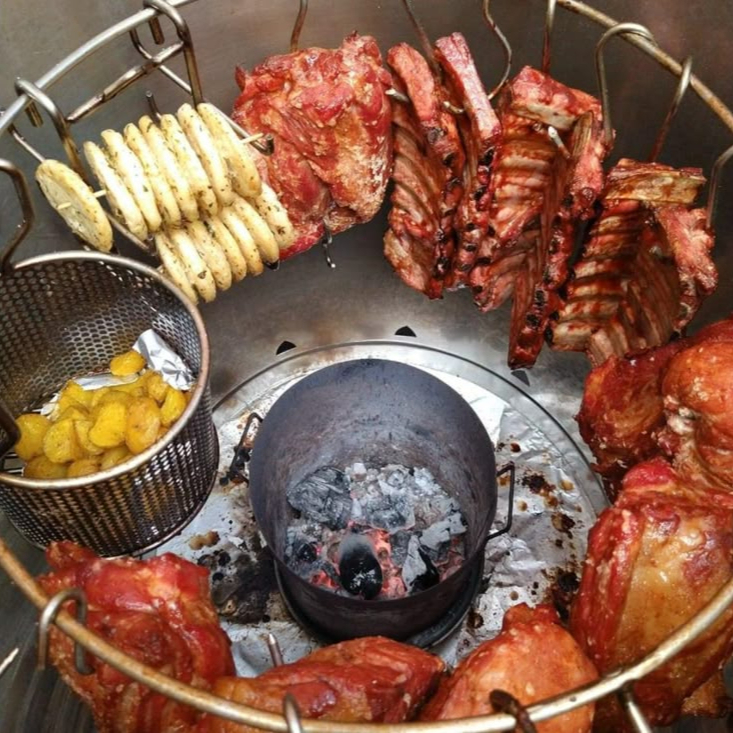 bondiola, chicharron, chorizo de la casa, costilla (800Gr en total) acompañada de papa, yuca y arepa, salsas de a casa, guacamole, chimichurry y salsa bbq