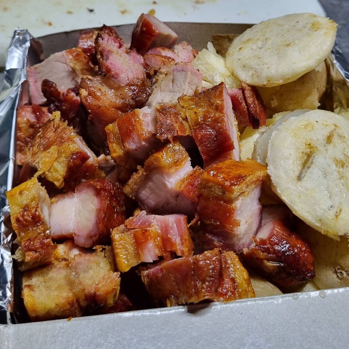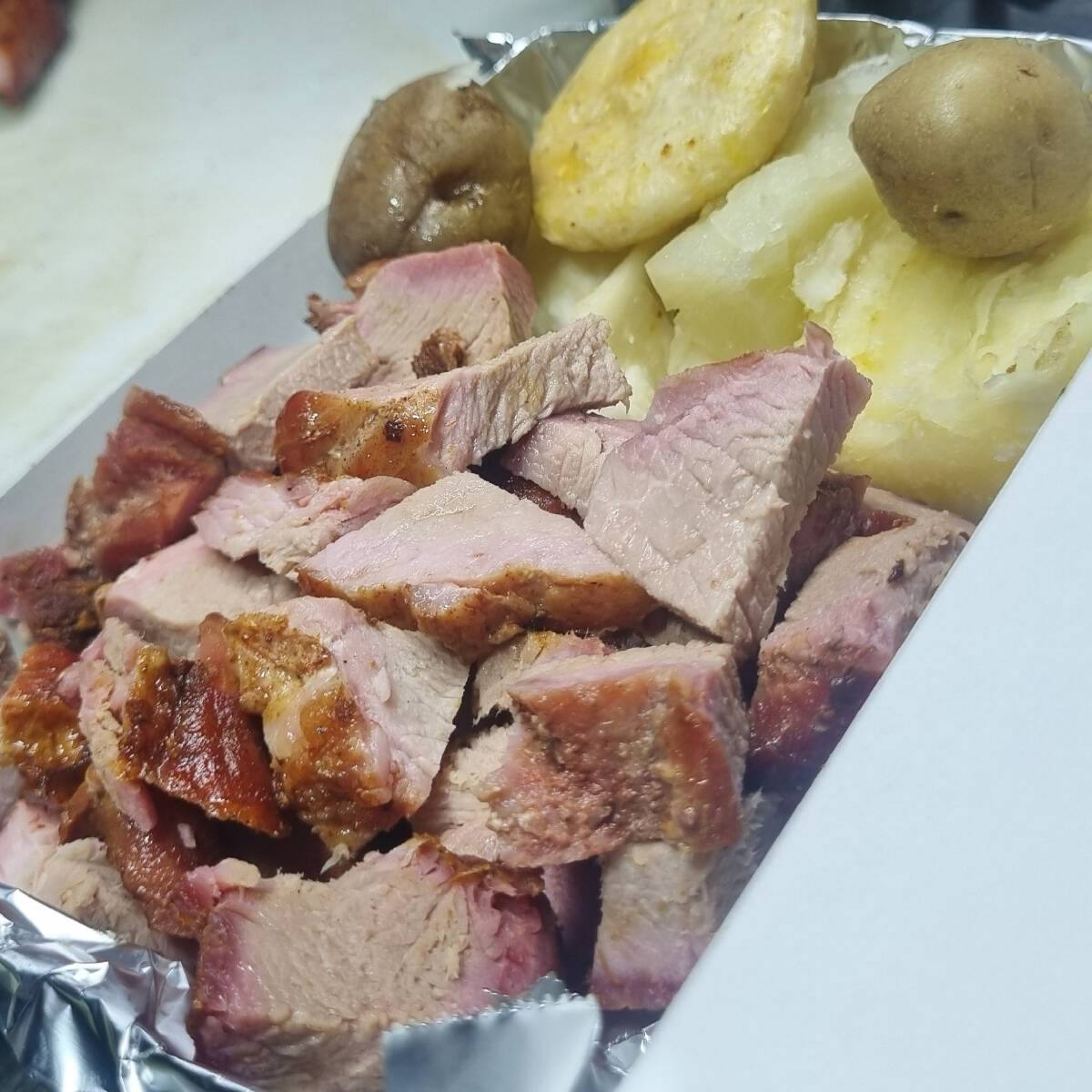 chicharrón ahumado al barril, acompañado de papa al vapor, yuca y arepa