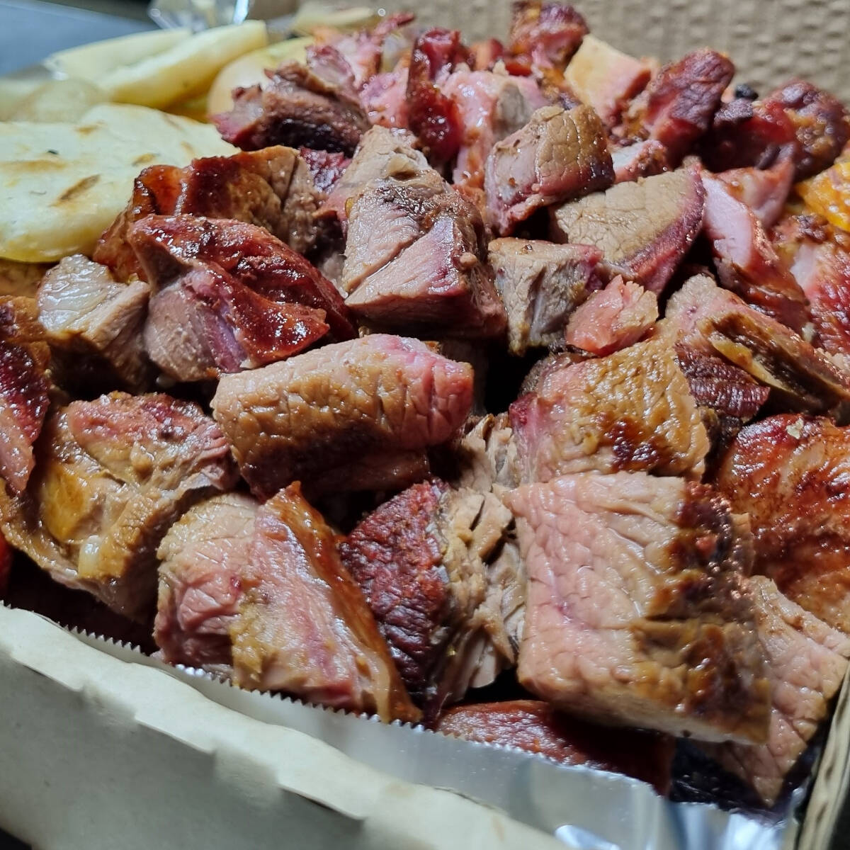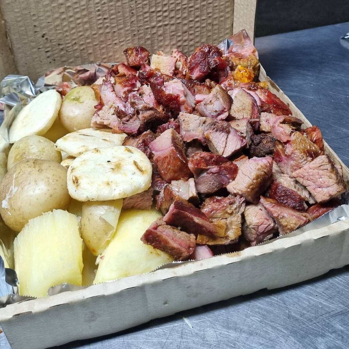Dos cortes de carnes a tu elección de carne ahumada al barril (400Gr), acompañada de papa cocida, yuca, y arepa