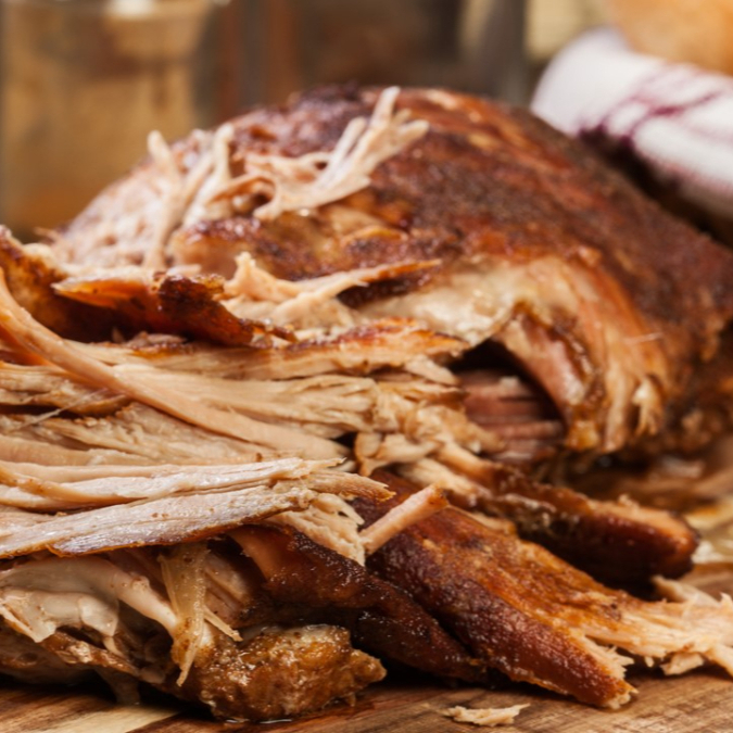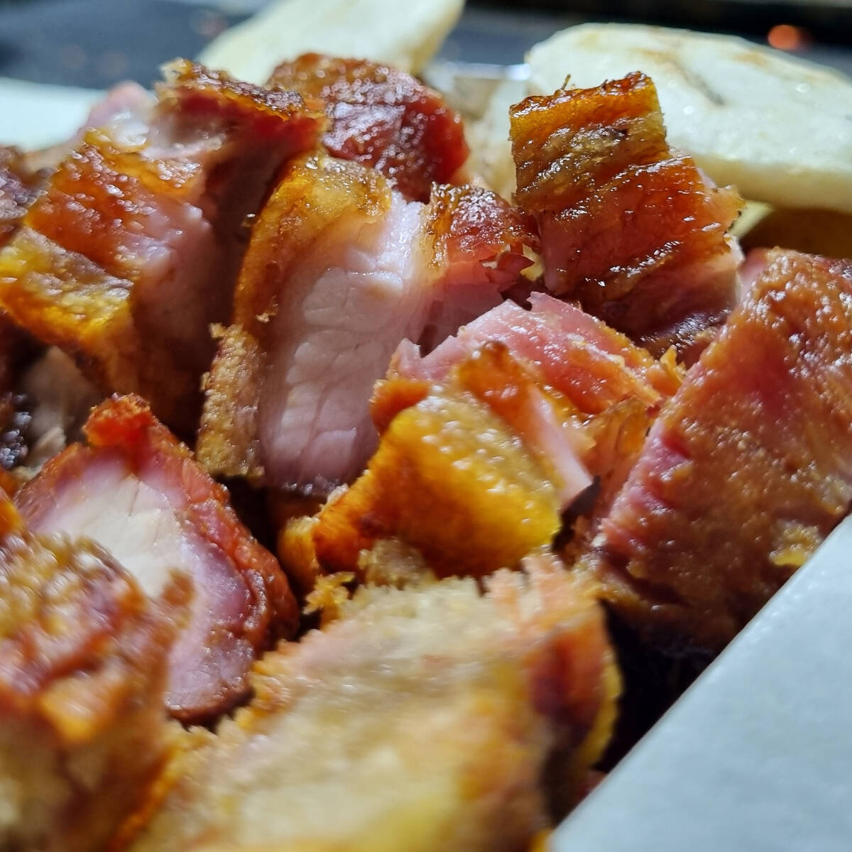 chicharrón crocante ahumado al barril (400gr) Bondiola de cerdo (220Gr), acompañada de papa cocida, yuca, y arepa