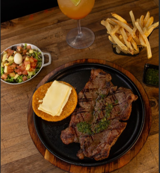 Corte premium, jugoso y con hueso largo pa’ lucirse. Dorado en su punto y servido con guarnición