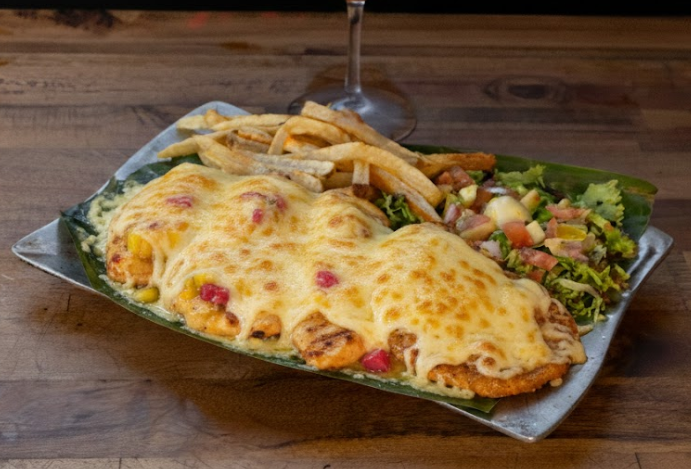 Filete cubierto con queso mozzarella gratinado en salsa de camarones y palmitos.