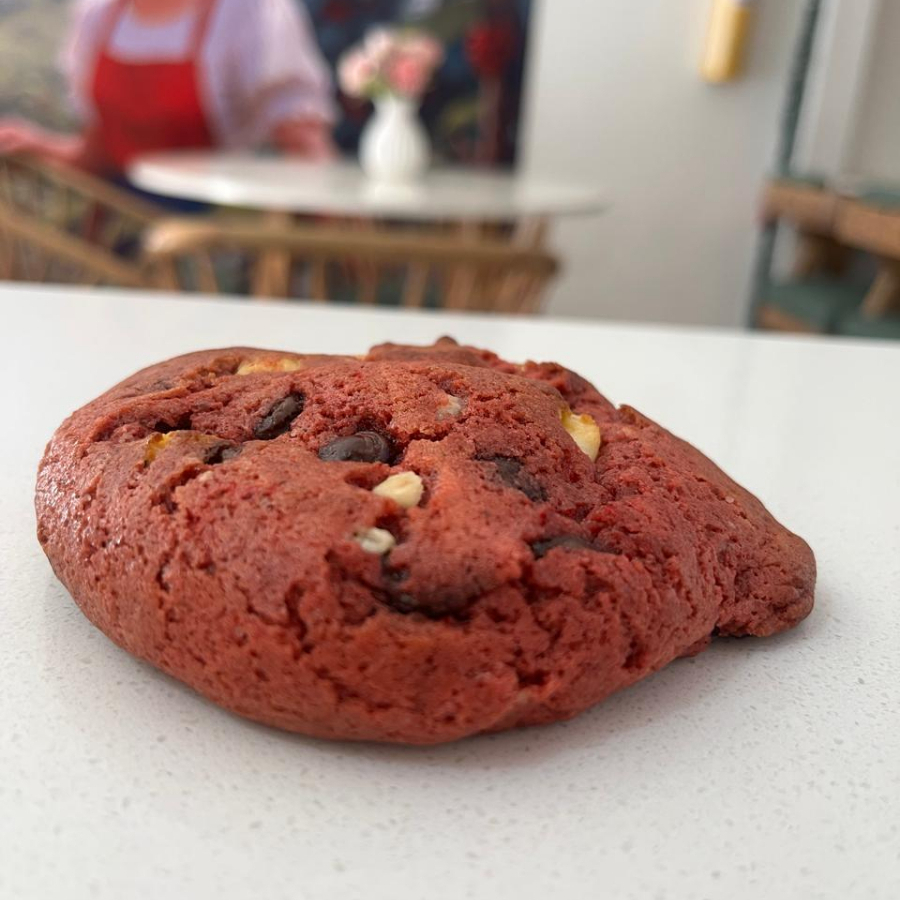 Galleta de RedVelvet con chispas de chocolate negro y blanco, rellena de un delicioso frosting de queso