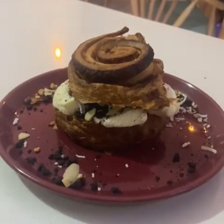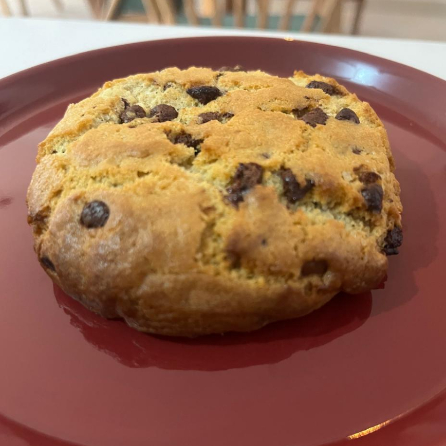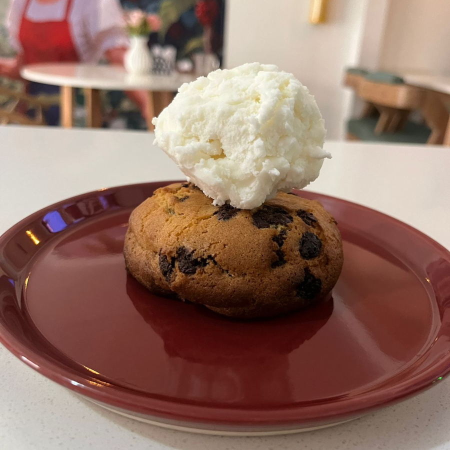 Galleta estilo New York con chispas de chocolate y relleno de crema de avellana acompañada de helado de vainilla