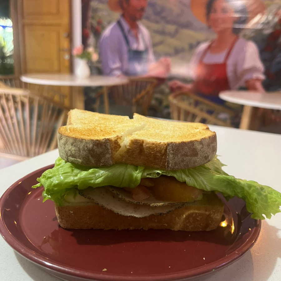 Pan de masa madre, jamón de pavo, queso mozarella, lechuga y tomate