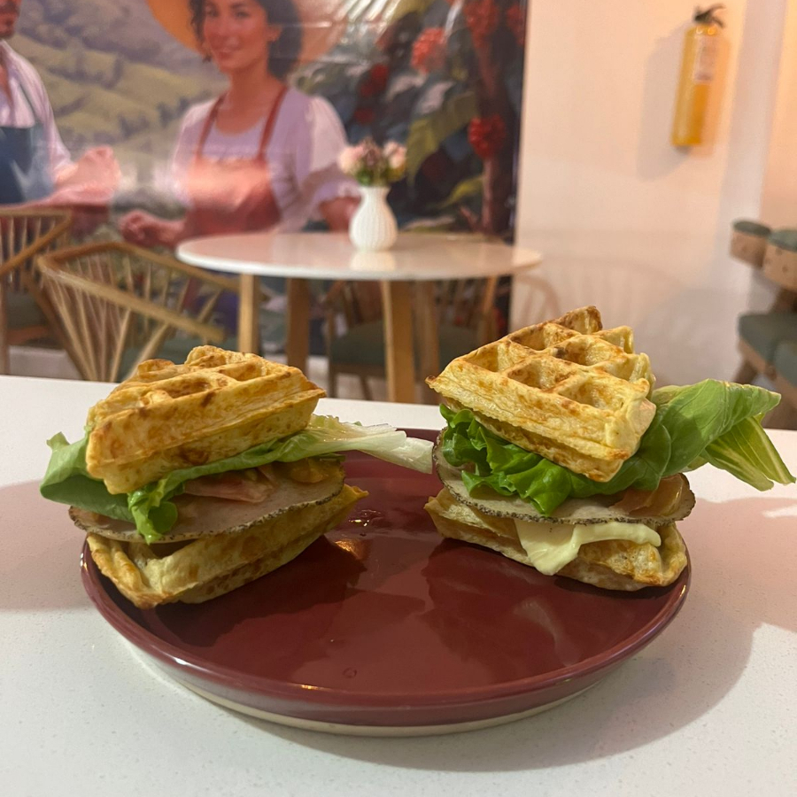 Waffle de pandebono, jamon de pavo, queso mozarella,lechuga y tomate