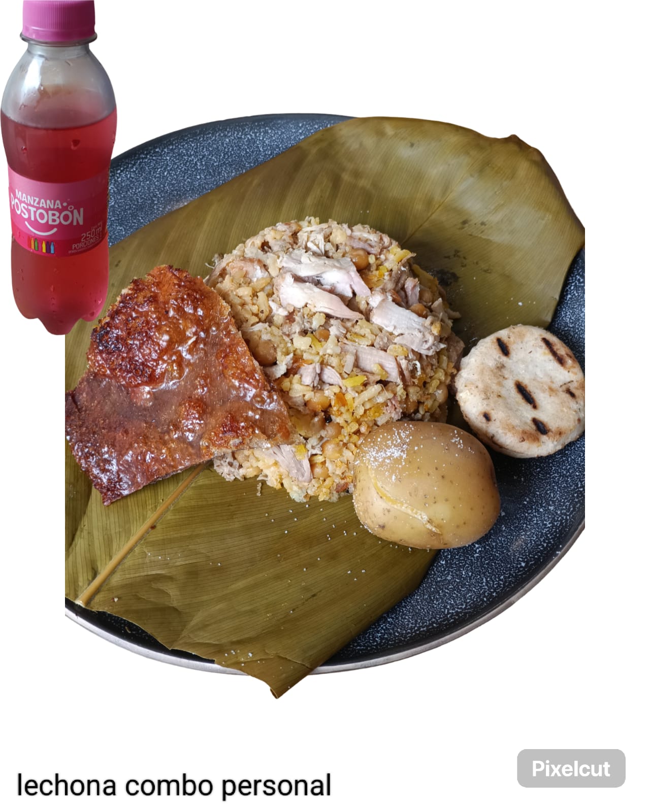 Lechona personal 260 g más arepa más papa más cuero crocante y gaseosa 250 ml