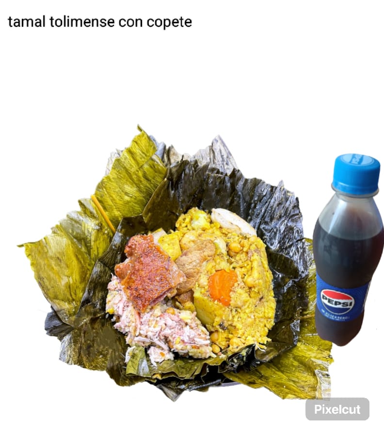 Tamal tolimense más pequeña porción de lechona 100 g más arepa más cuero crocante y gaseosa 400 ml
