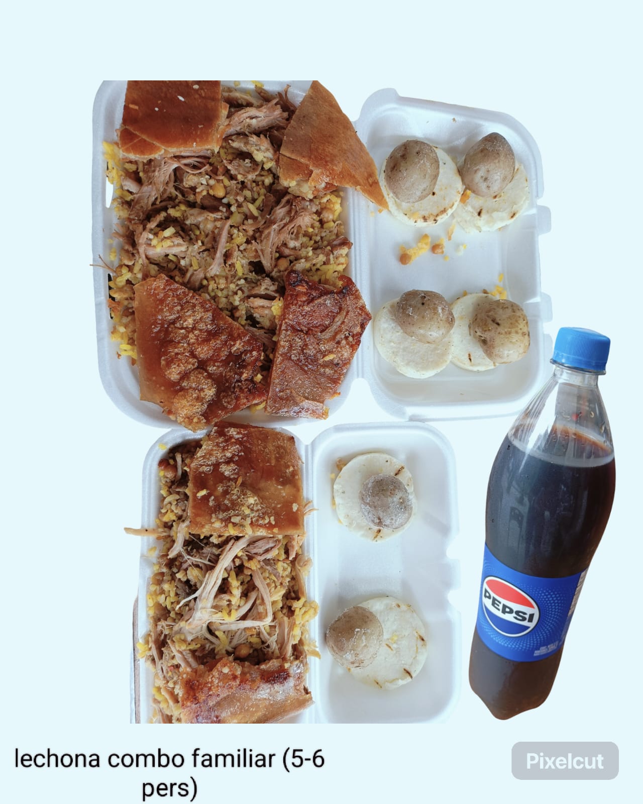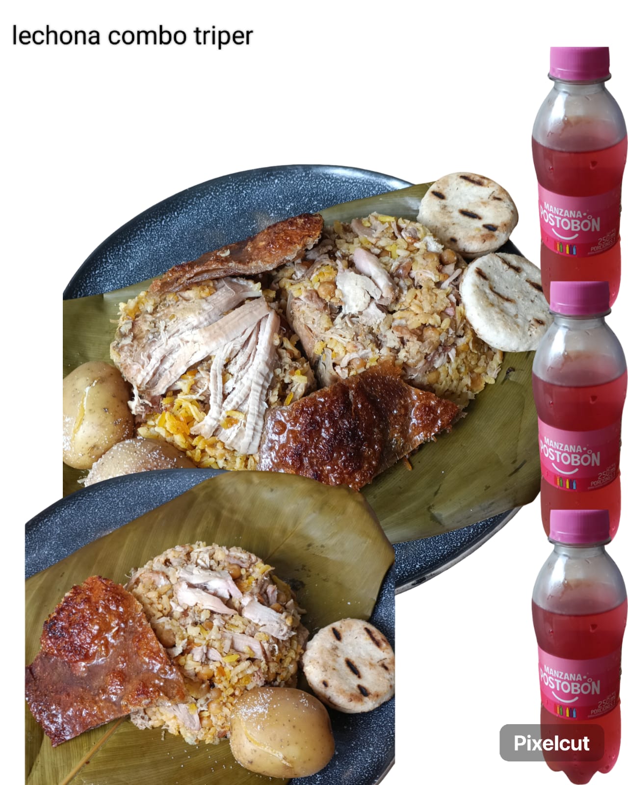 Lechona lb más lechona personal más 3 arepas más 3 papas saladas y 3 gaseosas 250 ml