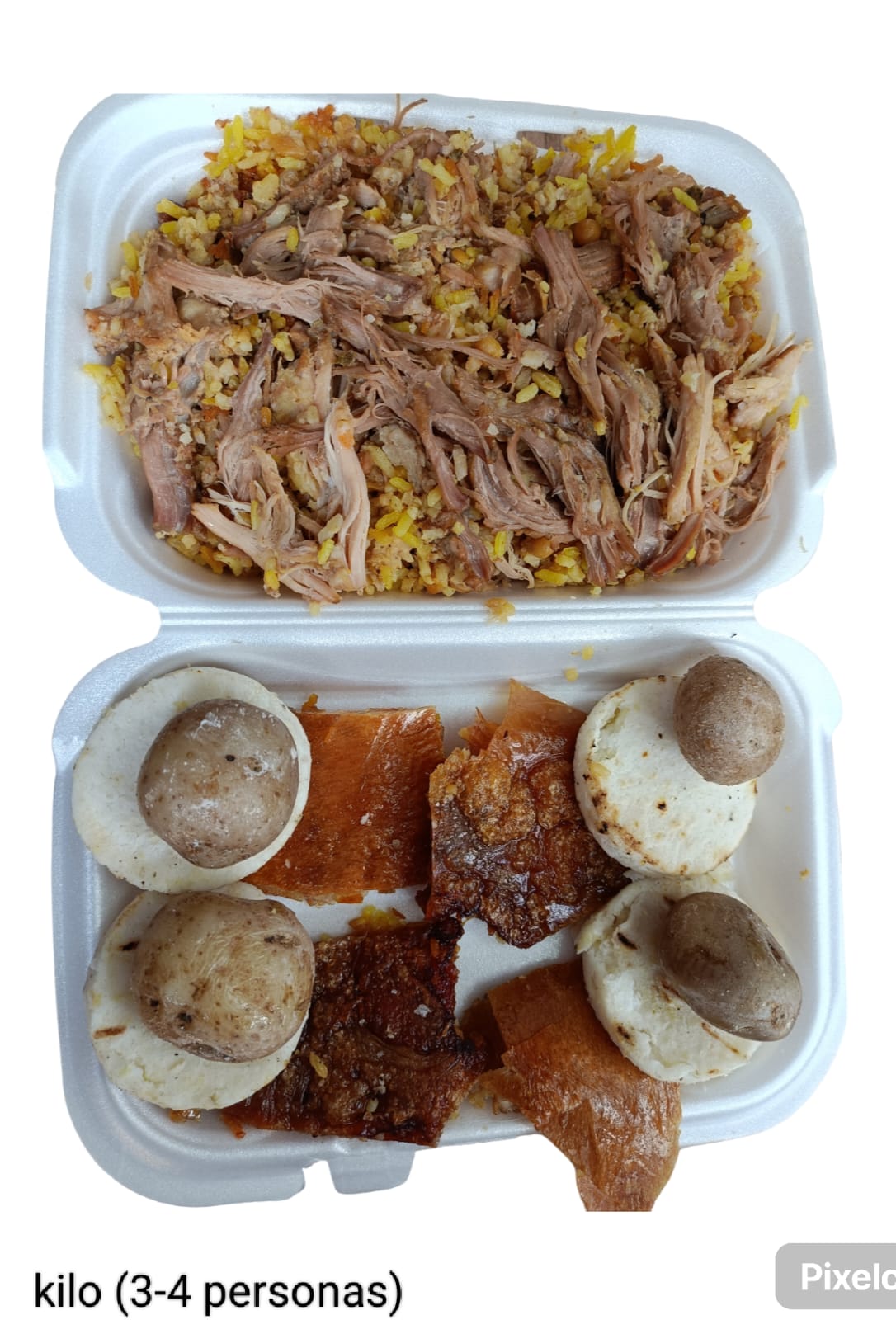 1 Kg más 1 lb de lechona más 6 arepas más 6 papas saladas más 6 cueros crocantes y gaseosa 1.5 L