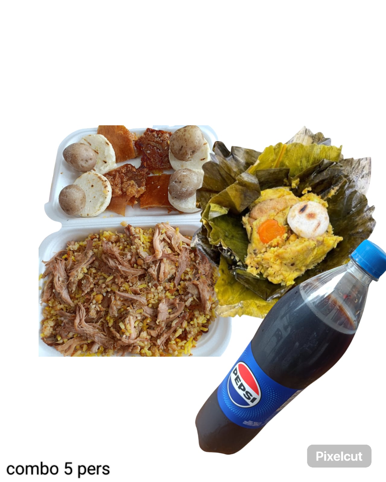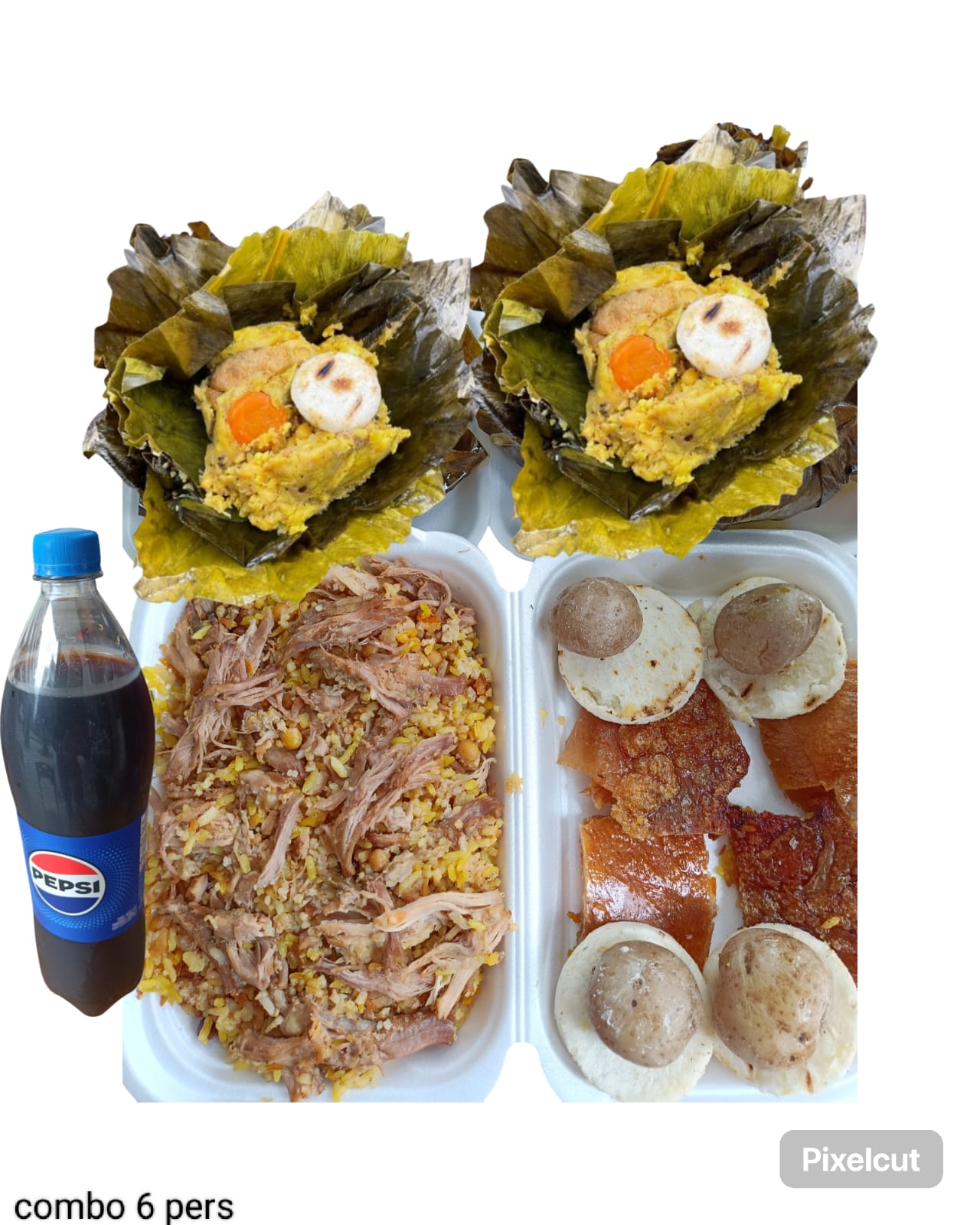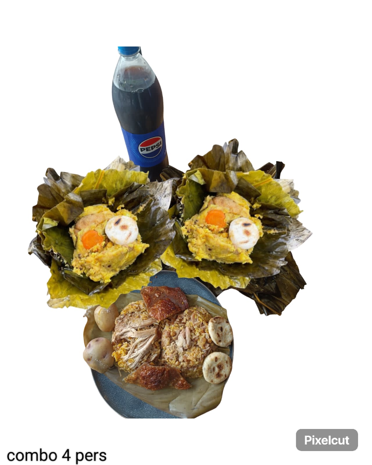 2 Tamales tolimenses más lechona 1 lb más arepas más papas más cuero crocante y gaseosa 1.5 L