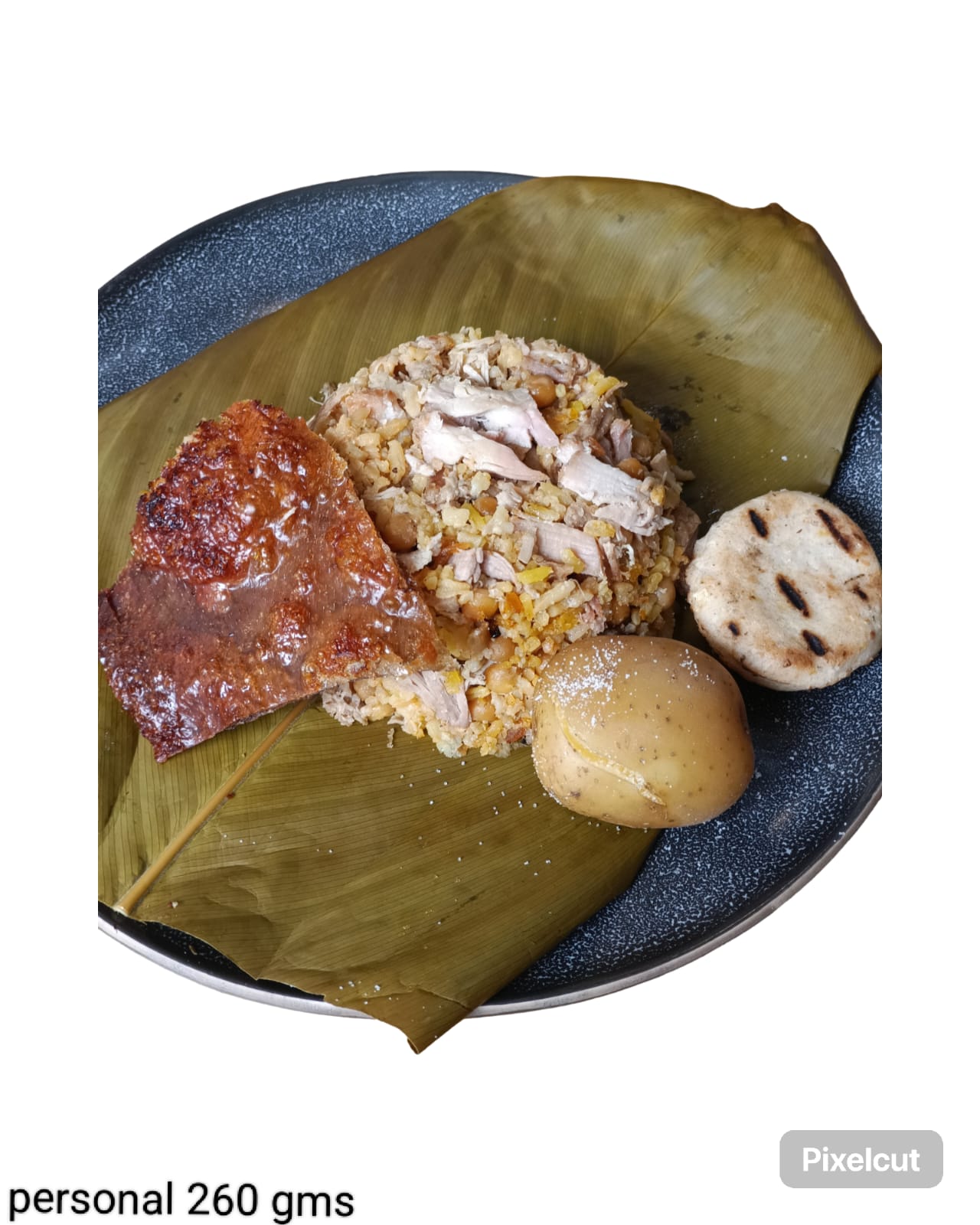 1 Tamal tolimense más 1 lechona personal más 2 chorizos de cerdo más arepas más papas más cuero crocante y 2 gaseosas 250 ml
