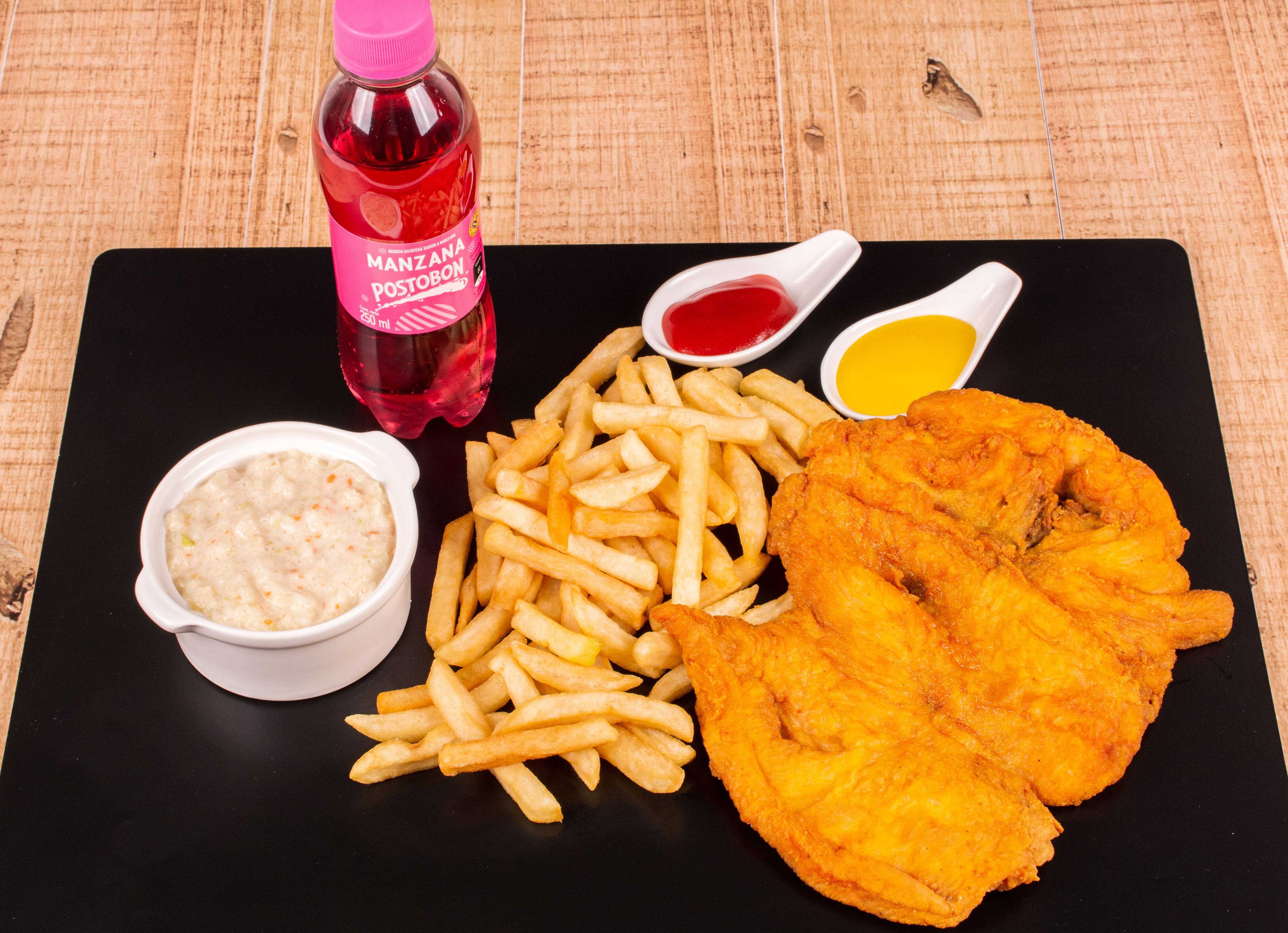 Pechuga de 350 gr apanada abierta + papas francesa 250 gramos aprox+ ensalada repollo + arepa ( gaseosa por aparte)