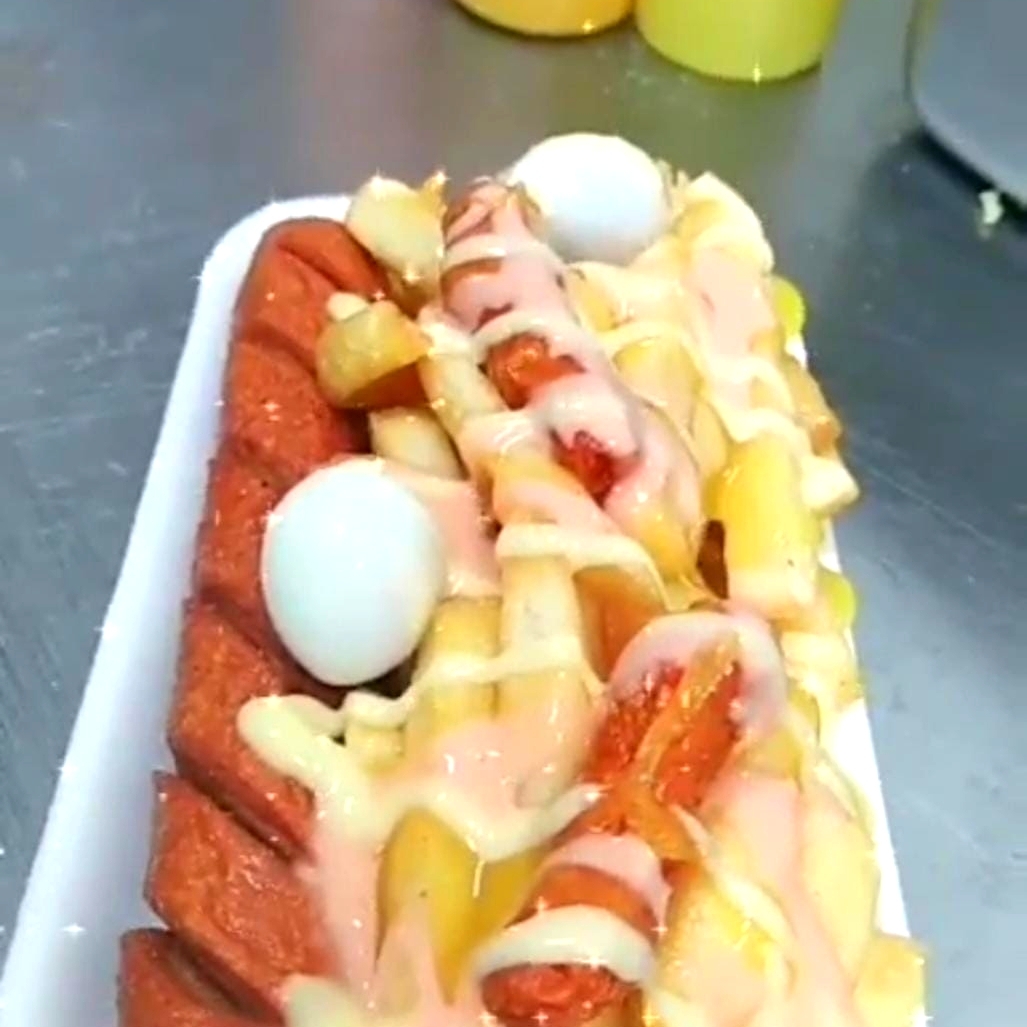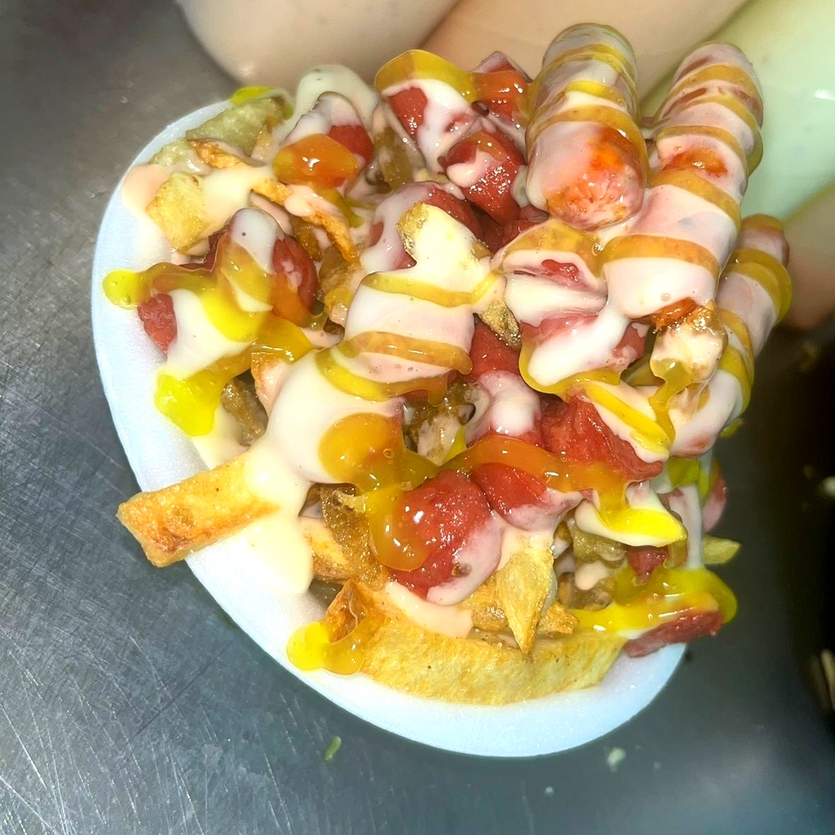 Pan artesanal, salchicha, ripio de papa y ensalada, queso y tocineta, Salchipapa Sencilla (Papas a la francesa acompañadas con salchicha, 1 huevo y salsas de la casa).