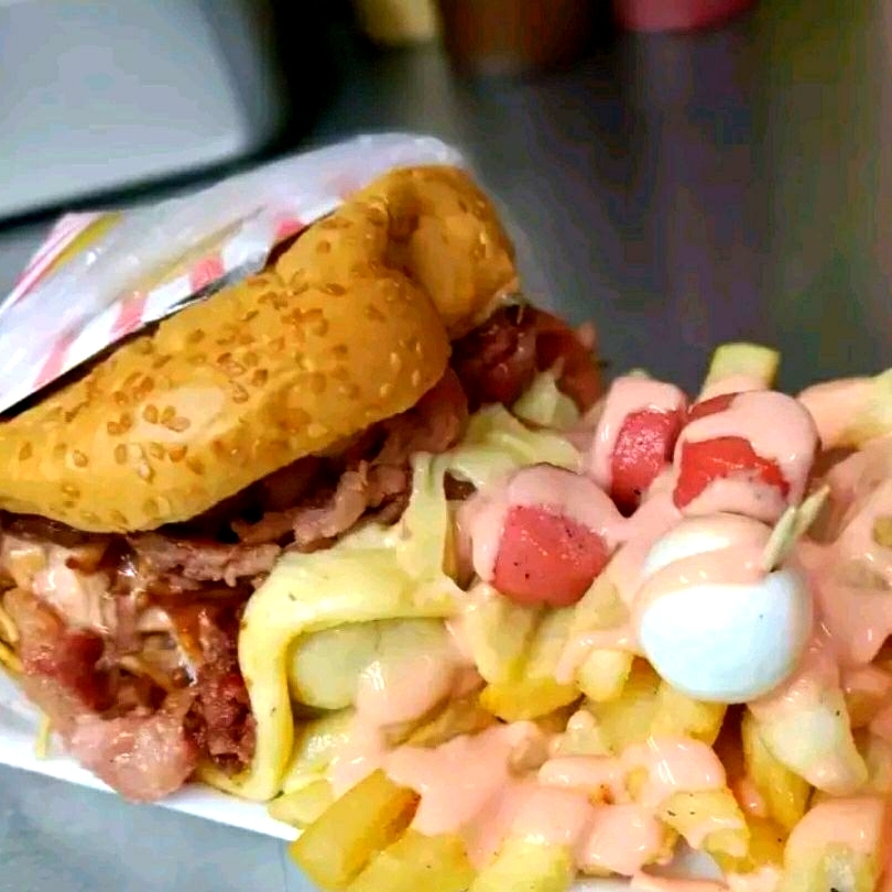 Hamburguesa con Queso y Tocineta (Pan artesanal, carne, ripio de papa y ensalada, queso y tocineta.), sSalchipapa sencilla (Papas a la francesa acompañadas con salchicha, 1 huevo y salsas de la casa).