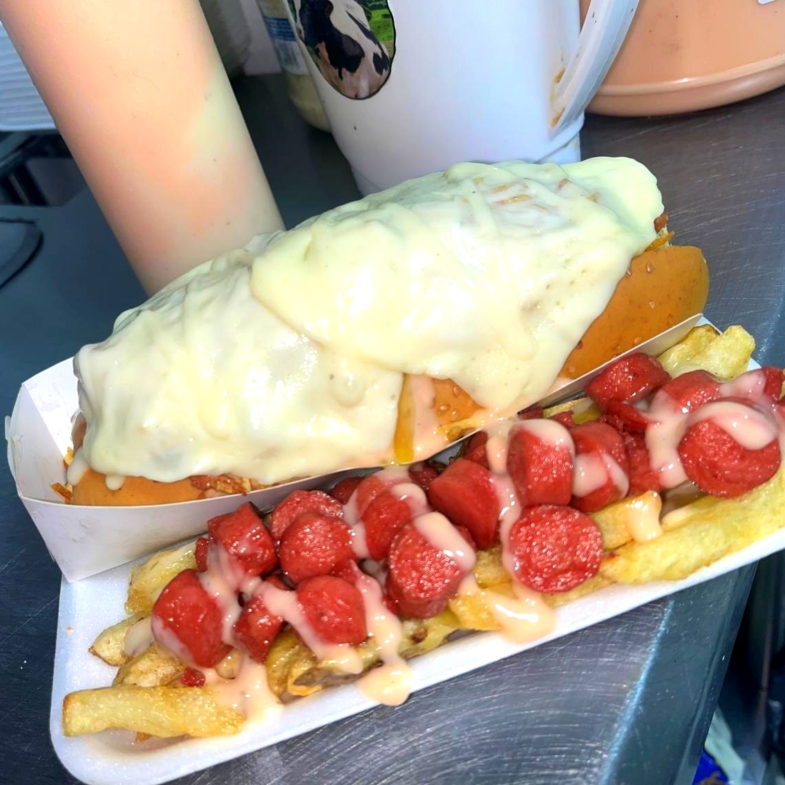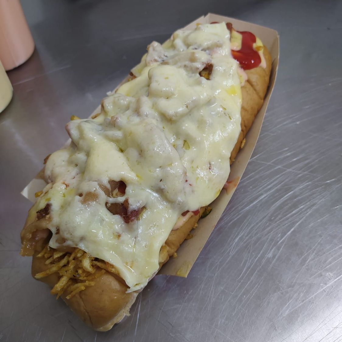 Pan artesanal, ripio de papa y ensalada, doble salchicha, tres queso y tres tocineta.