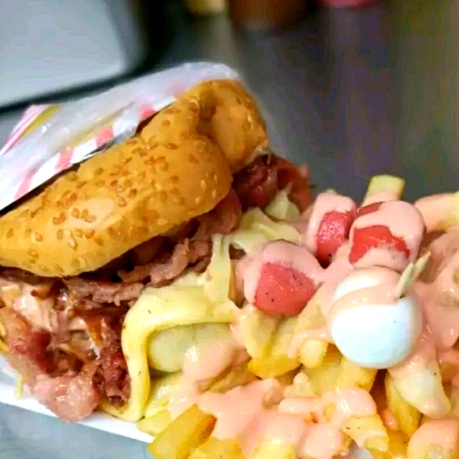 Hamburguesas Tres Quesos Tres Tocinetas (Pan artesanal, carne, ripio de papa y ensalada, doble carne, tres queso y tres tocineta.), salchipapa sencilla (Papas a la francesa acompañadas con salchicha, 1 huevo y salsas de la casa).