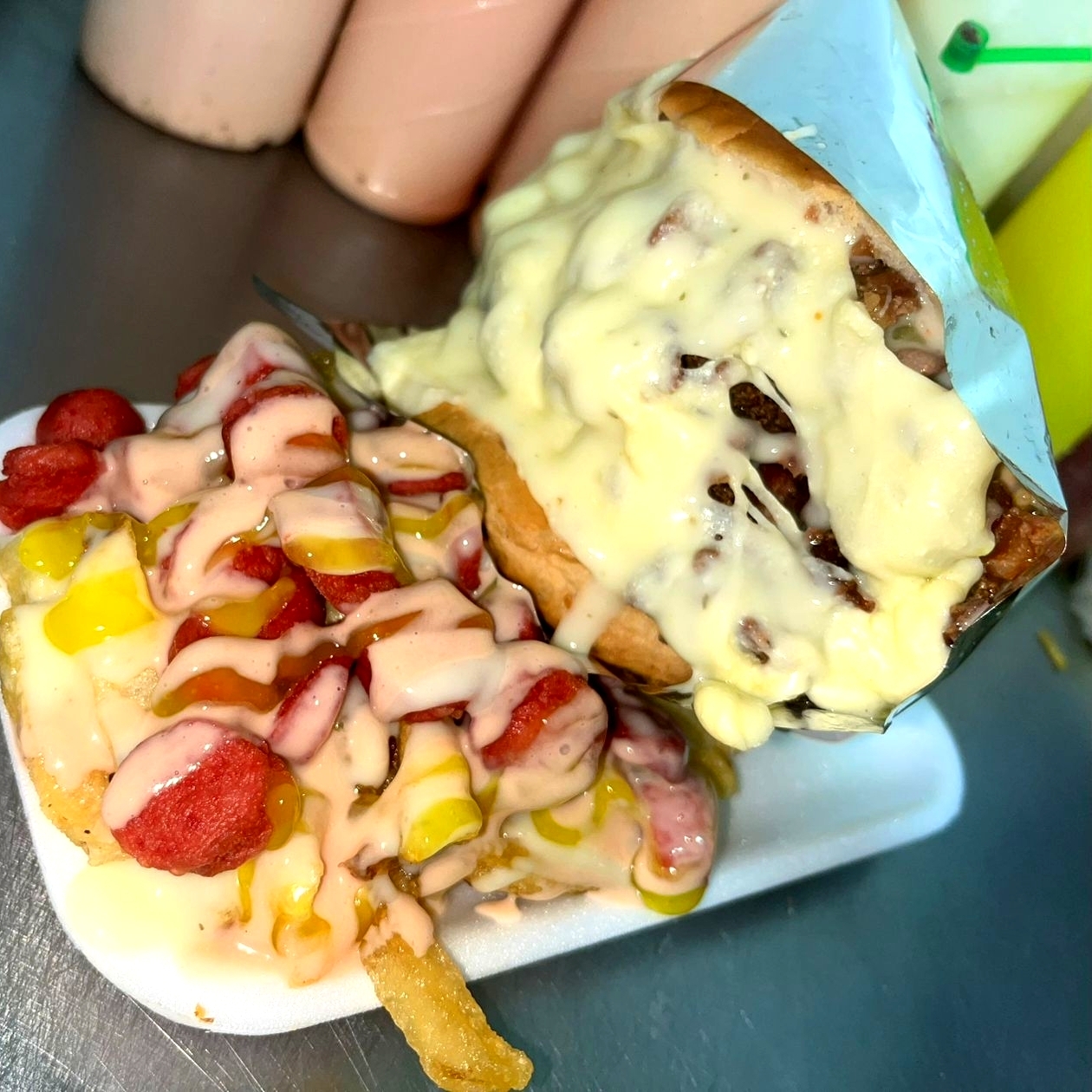 Pan artesanal, salchicha, ripio de papa y ensalada, doble queso y doble tocineta, Salchipapa Sencilla (Papas a la francesa acompañadas con salchicha, 1 huevo y salsas de la casa).