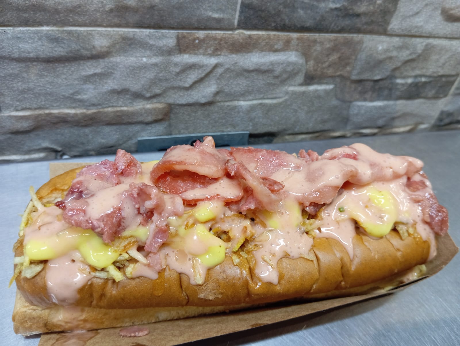 Pan, salchicha doble, queso, doble tocineta, doble carne, ripio, ensalada dulce.