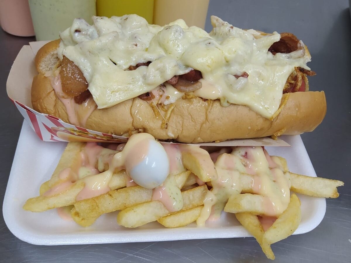 Pan, salchicha, queso, tocineta, carne, ripio, ensalada dulce.