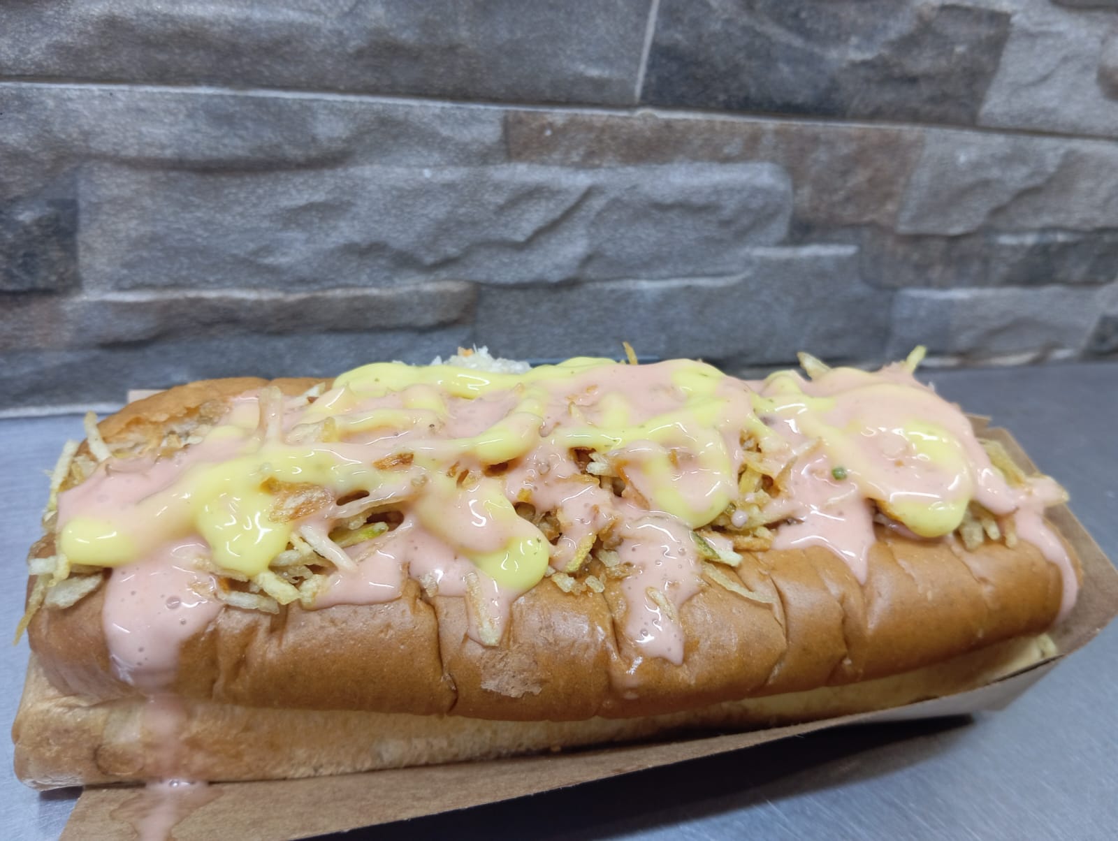 Pan, salchicha, ensalada dulce, ripio de papa.