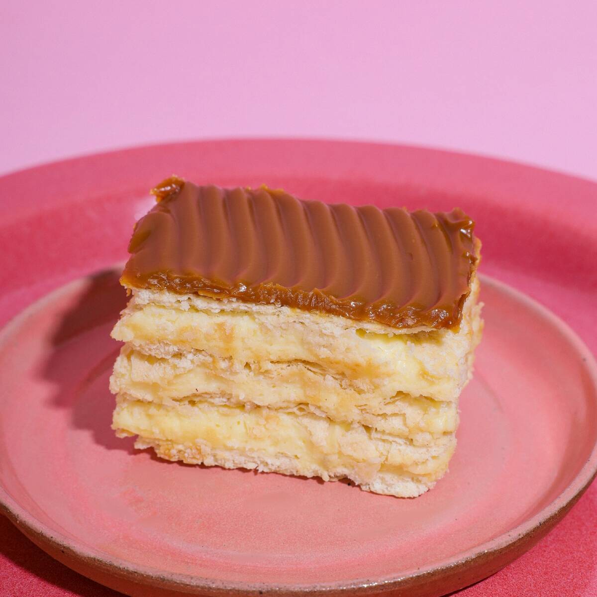 Capas de hojaldre rellena y cubierta con con crema inglesa. Tamaño personal.